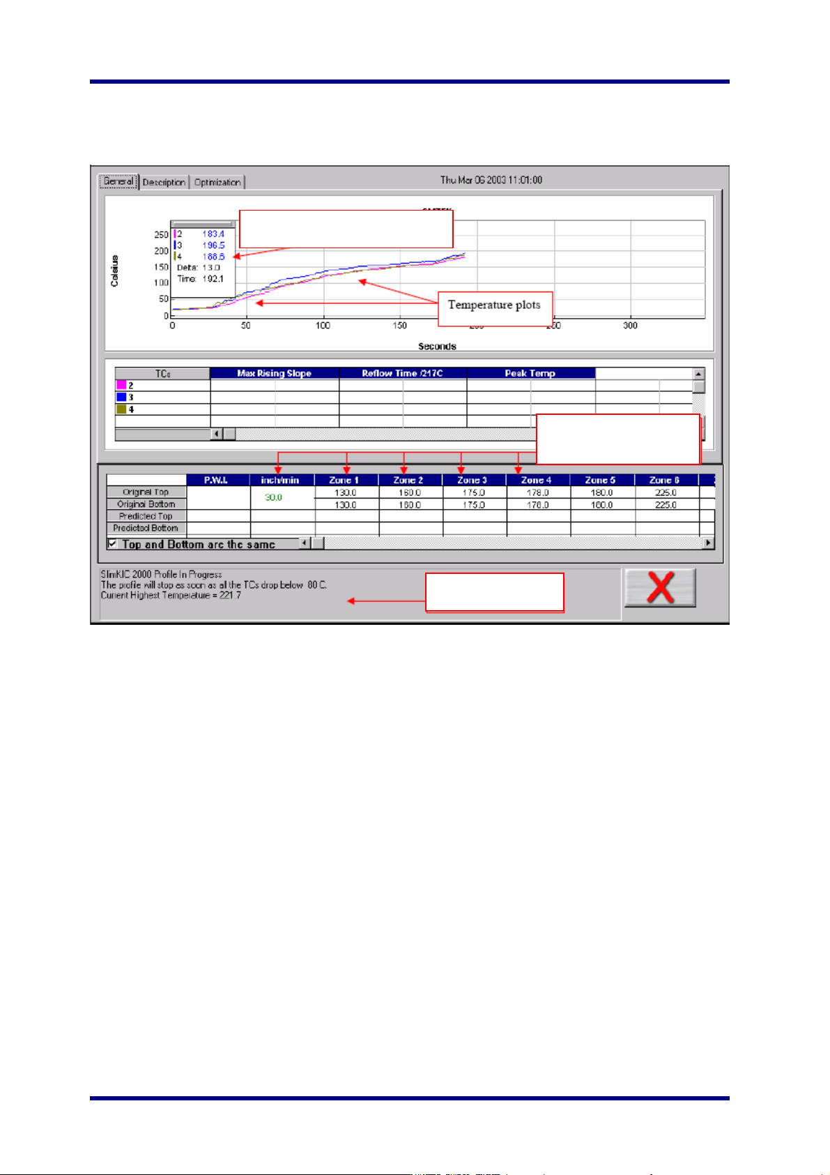 KIC 2000 v2.0.5.x KIC2000 用户手册 Page 35 在实时曲线测量期间 (During the Live Profile): • 实时曲线会在曲线图中自动画出 ( 仅限于 SlimKIC 2000 无线传输 ) 。 • 在曲线图的左上角会有一个小窗口, 里面显示了热电偶的当前温度和 温差,同时也会显示实耗时 间 ( 仅限于 SlimKIC 2000 无线传输 ) 。 • 当前曲线的炉子温度设置值和轨道速 度都会…