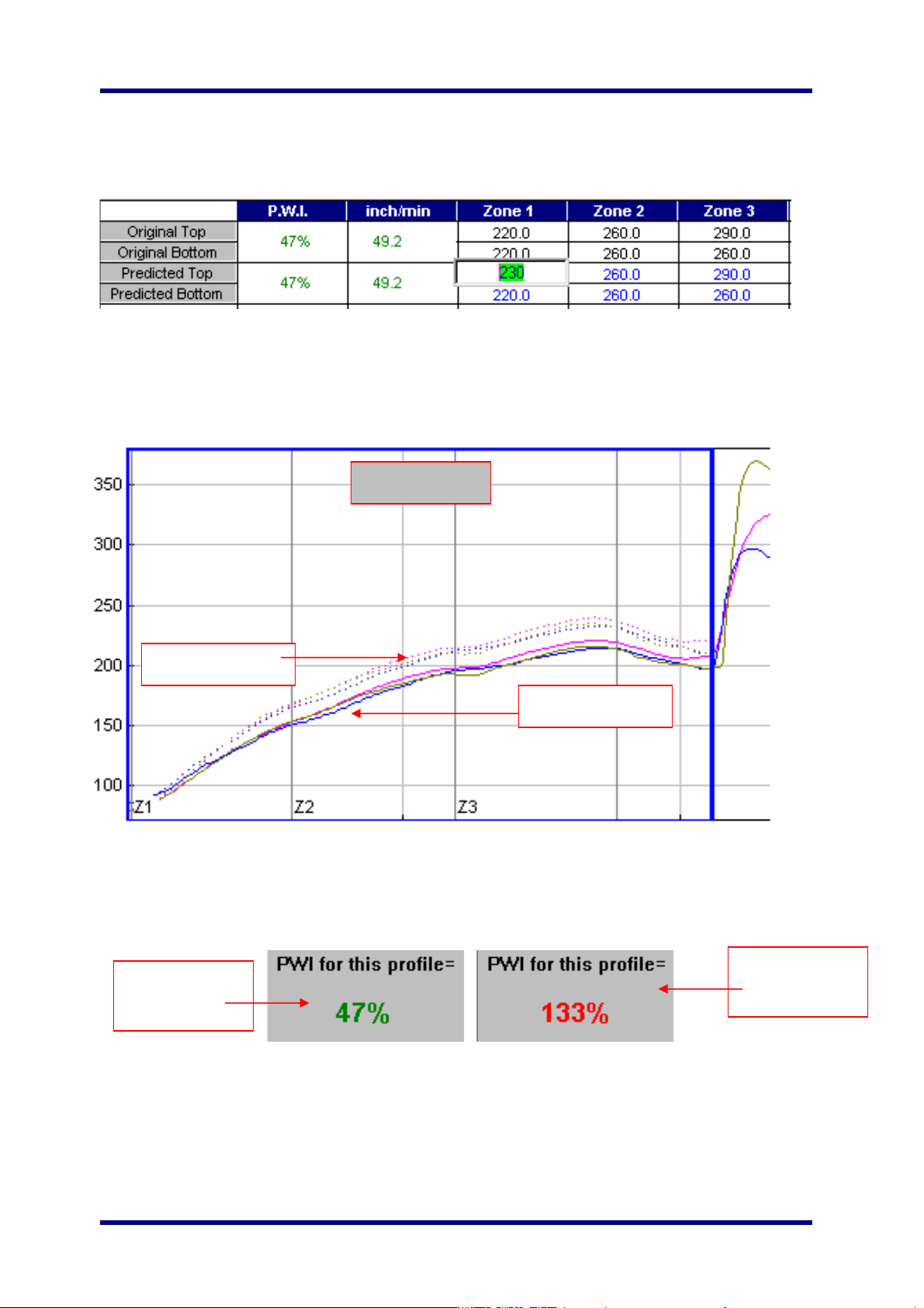 KIC 2000 v2.0.5.x KIC2000 用户手册 Page 60 如果你想预测更改后的炉子参数设置 或者预测修改后的 Navi gator 预测结果,那么点 击你想修改的温区并 修改它。以下是一个温区 1 被选中的 例子, 输入新的温度设置,然后按回车键。 N avigator 会预测 更改的结果,然后自动更新 PWI ,预测数据统计和 曲线图。新的预测结果将会以虚线的 方式显示在图中。这种方式使用 户轻松地区别出原始和预测…