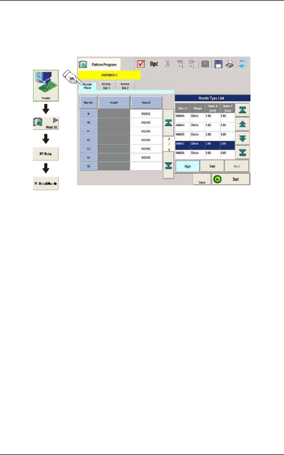 When the [Nozzle Place] tab is pressed in the "PL Head/Nozzle" window, the following tab sheet