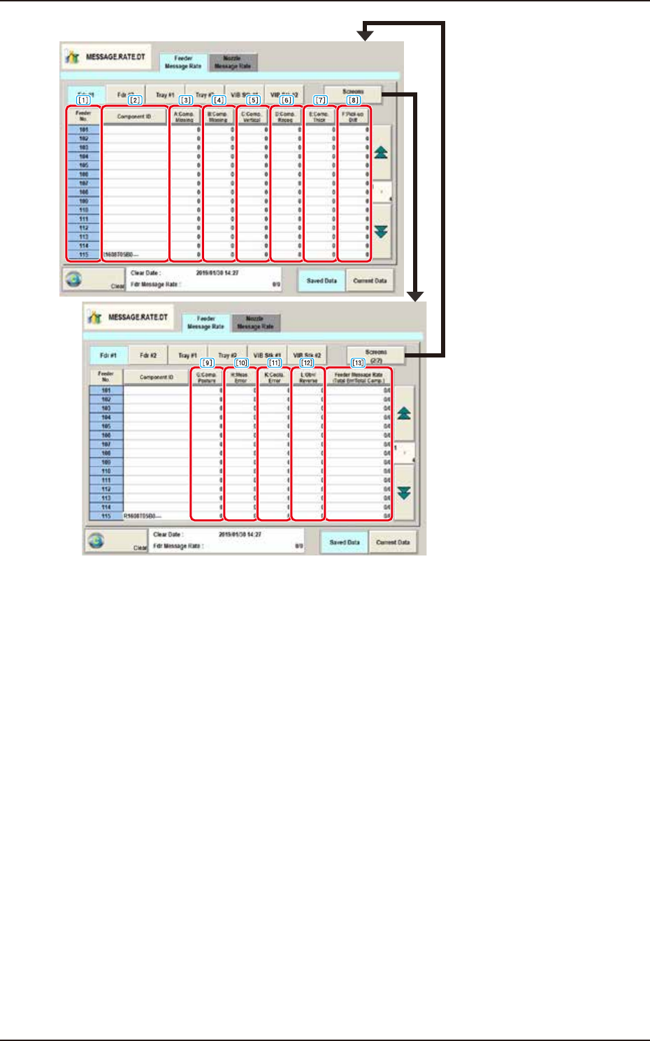 EUKYX 4-28 199-2100 4.1 "Feeder Message Rate" T ab Sheet F2D22 [ 1 ] Feed er No. (Actual Fdr No.) Shown are the feeder Nos. [2] Compone nt ID Each te xt box shows the component IDs f or each i ndivi dua l feede…