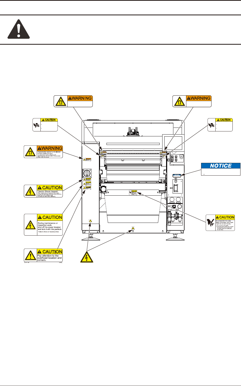 The alert labels are affixed on dangerous and caution-required areas.