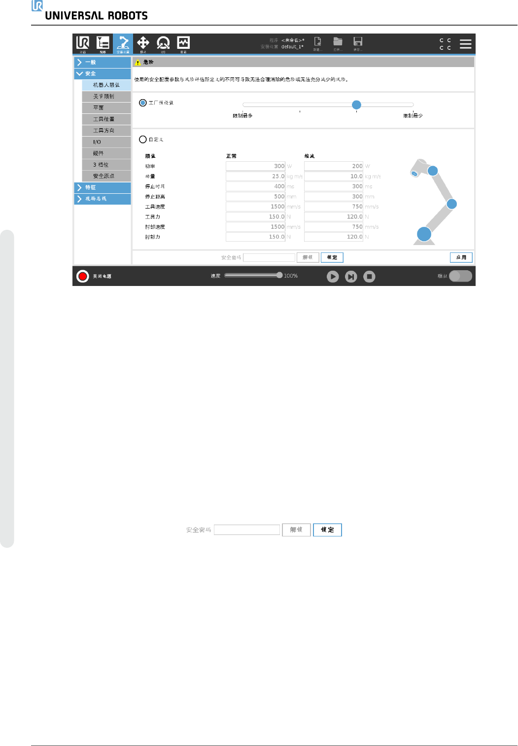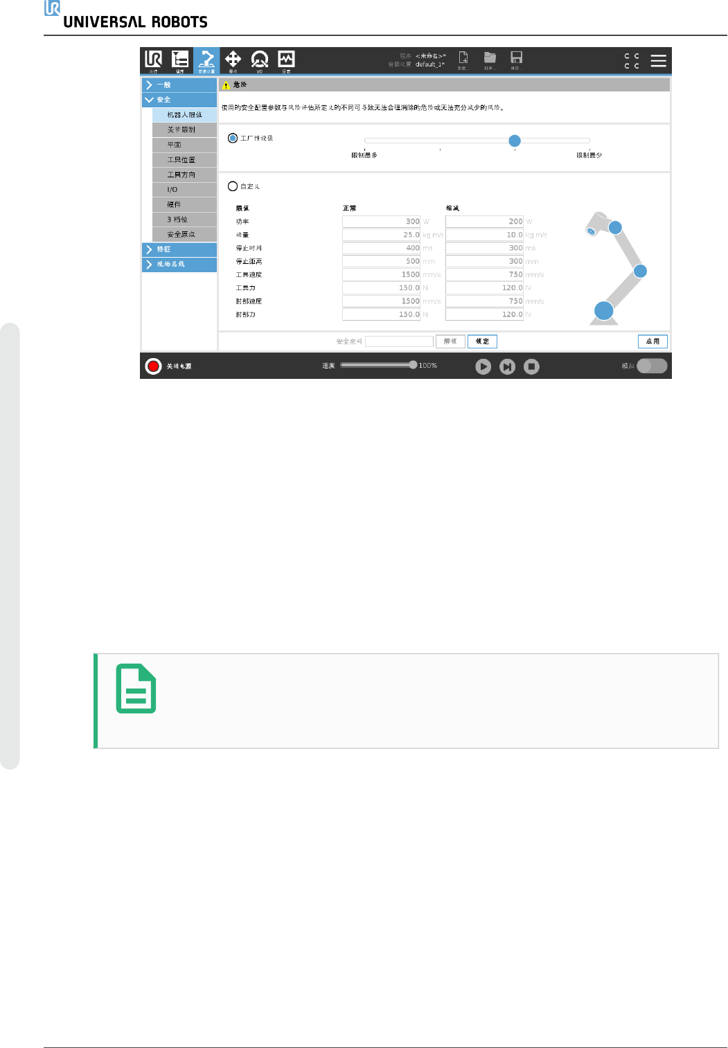 “在靠近机器人作业前,确保安全配置符合预期。这可以通过检查 PolyScope 右上角的安全校