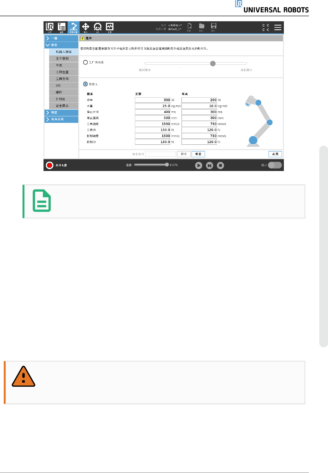 2. 在 “ 自 定 义 ” 选 项 中 , 您 可 以 设 置 机 器 人 运 行 的 限 值 并 监 视 相 关 公 差 。 功 率 限 制 机 器 人 在 环 境 中 产 生 的 最 大 机 械 功 。 此 限 制 将 有 效 载 荷 视 为 机 器 人 而 非 环 境 的 一 部 分 。 动 量 限 制 最 大 机 器 人 动 量 。 停 止 时 间 限 制 机 器 人 停 止 所 需 的 最 长 时 间 , 例 如 , 当 紧…
