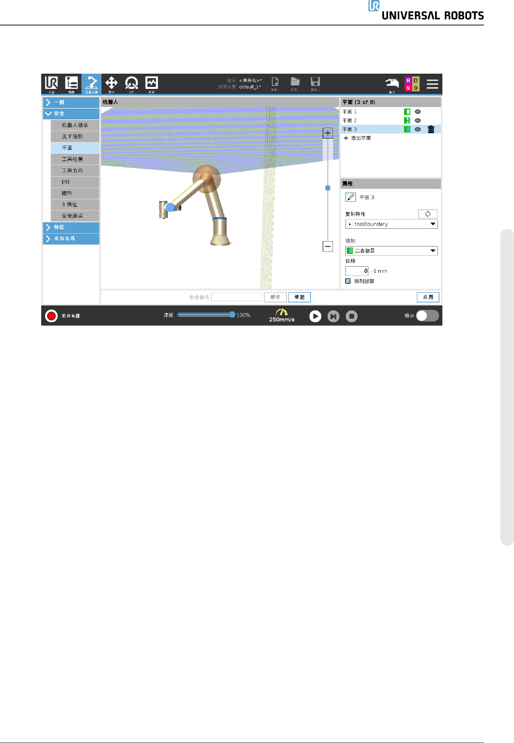 模式。安全系统会阻止球上的任何点通过安全平面( 请参