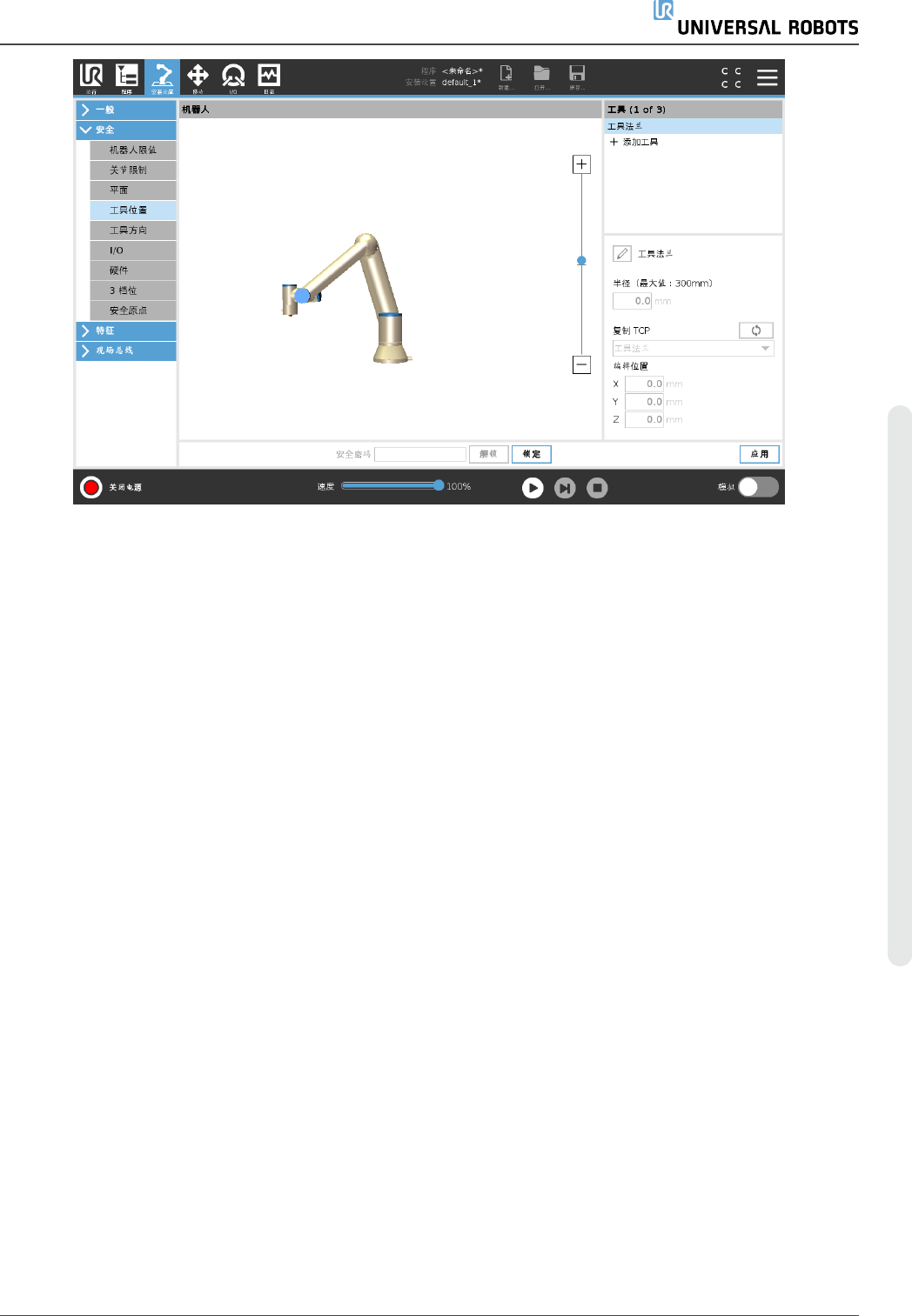 位置用于相对于机器人的工具法兰更改工具位置。针对工具速度、工具力、停止距离和安全平