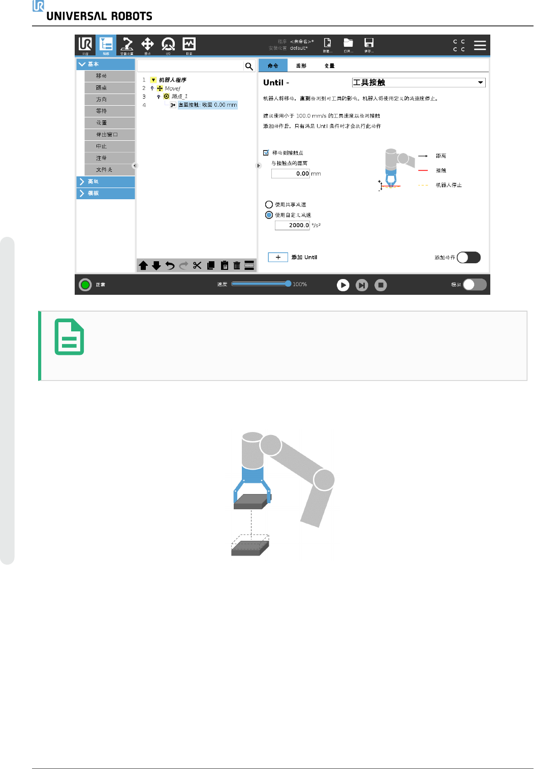 程序节点 Until 工具接触允许机器人在与工具建立接触后停止运动。您可以定义工具停止和撤