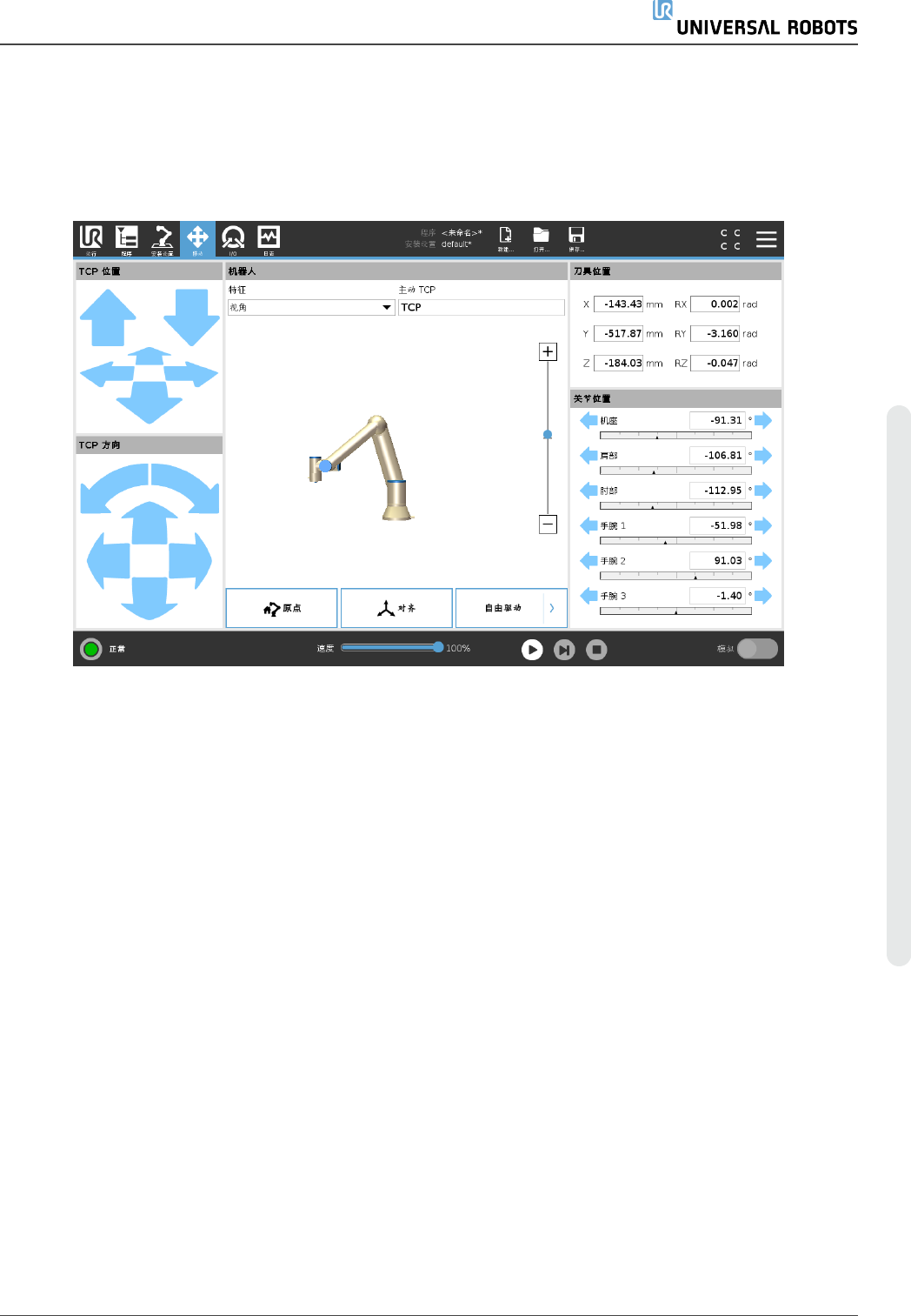屏幕上的自由驱动按钮可将机器人手臂拉到所需的位置/位姿。