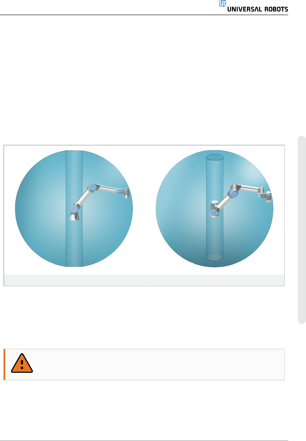 虑机器人正上方和正下方的圆柱体空间。应避免将工具移向圆柱体空间,因为这样会造成工