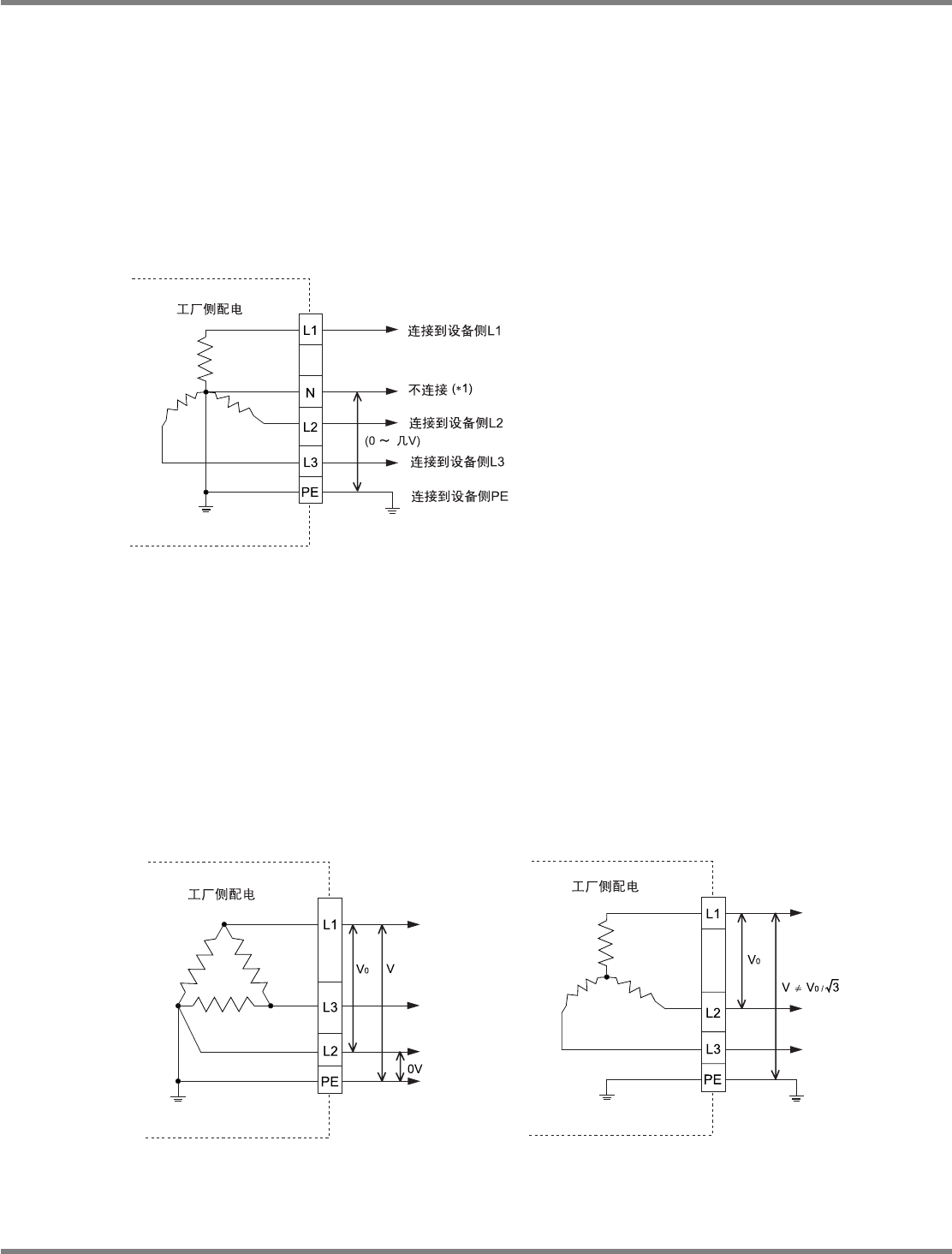 NPM-D 安装篇 1.1 设置准备 Page 1-10 EJM1DC-MB-01I-00 电源有无接地的简易确认方法 ( 用检测器确认 ) ① L1 、 L2 、 L3 、 N 、 PE 的 5 条被拉出时 ( 星形接线 ) 请测量在 N 、 PE 之间的电压。 • 接地中性线时 数值几乎在 0 ~ 几 V 的范围内稳定 → AC 290 V 以上时可连接 • 未接地中性线时 数值不稳定 ( 几十 V 以上时显示 ) → AC 2…