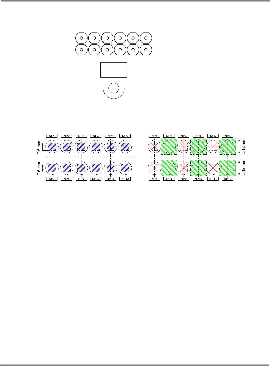 NPM-D 安装篇 2.4 其它规格 Page 2-44 EJM1DC-MB-02I-00 12 吸嘴吸头的吸嘴布局 可以安装 12 根能对应 6 mm × 6 mm 以下元件的吸嘴 ( 如上页所示的标准吸嘴 ) 。 12 吸嘴吸头的吸嘴布局和最大安装 数量 ( 图为俯视状态图 ) 超过 6 mm × 6 mm 的部品有吸着限制。 ( 只对应偶数吸嘴。 ) 0402 ≤ 元件范围 ≤ 6 mm ± 6 mm 6 mm ± 6 m…