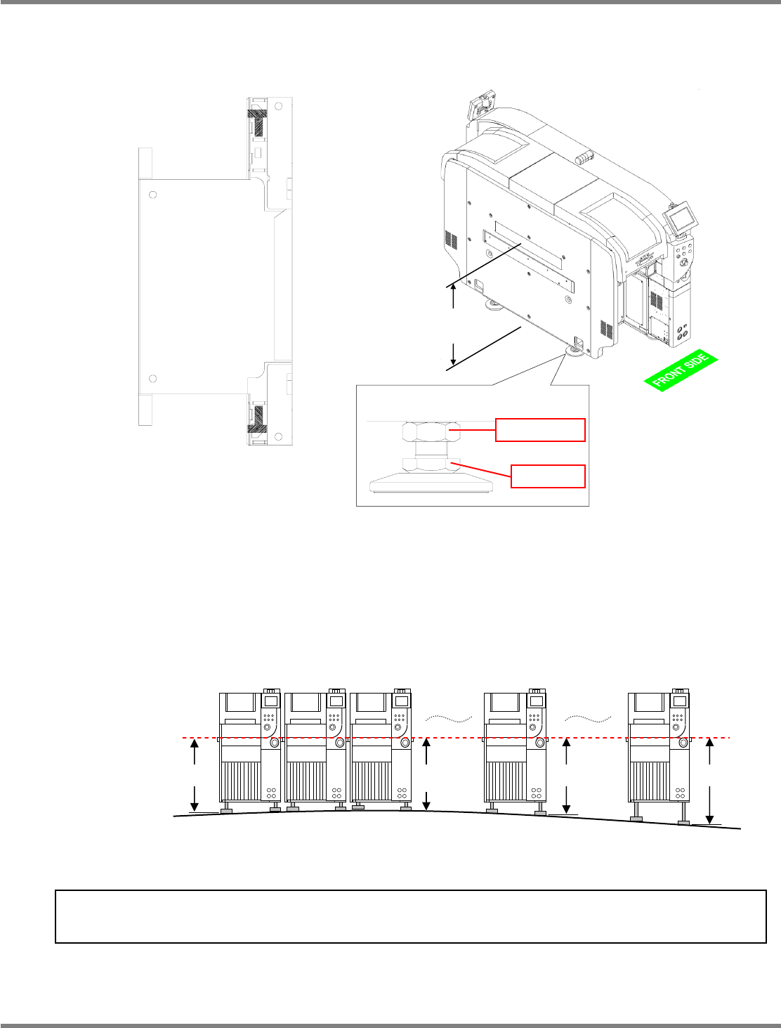 NPM-D 安装篇 1.2 设置步骤 EJM1DC-MB-01I-00 Page 1-19 1.2.4 调整水平的位置 在下图所示位置安装水平仪 (0.02 mm/m) , 用调整螺栓调整至 1 刻度 (0.02 mm/m) 以下。 调整后, 请拧紧 锁定螺母对其固定。 ○ : 调整螺栓 4 处 ■ : 水平仪设置位置 4 处 有关基板传送高度 NPM-D 的标准基板传送高度是 900 mm ~ 920 mm 。 根据客户工厂的地面…