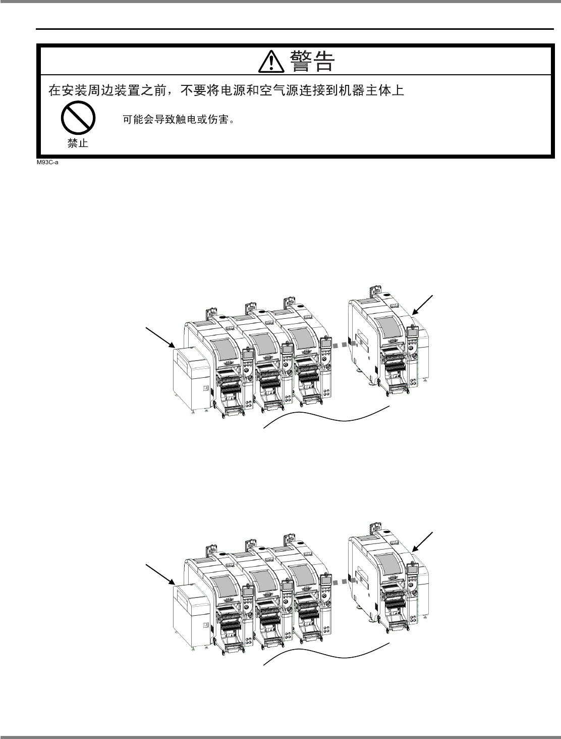 NPM-D 安装篇 1.3 周边装置和电缆的连接 EJM1DC-MB-01I-00 Page 1-27 1.3 周边装置和电缆的连接 1.3.1 生产线的构成 设置 NPM-D 时 ( 包含生产线构成、 单体设置 ) ,需 在 NPM-D 生产线的左右两侧设置具有 生产线伺服功能及 延长传送带功能的装置。 连结台数在 15 台以下时 连结台数在 16 台以上、 30 台以下时 当连接台数在 16 ~ 30 台时,需要在最右端设置…