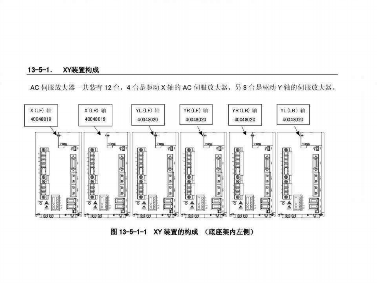 13 - 5 - 1 . XY 装置构成 AC 伺 服 放 大 器 共 装 存 1 2 台 , 4 台 是 驱 动 X 轴 的 AC 何 服 放 大 器 , 另 8 台 是 驱 动 Y 轴 的 何 服 放 大 器 。 YL ( LF ) W 4 0 0 4 8 0 2 0 YR < LR > Wl 4 0 0 4 8 0 2 0 X < LF > 轴 4 0 0 4 8 0 1 9 X 〈 LRHl : | …