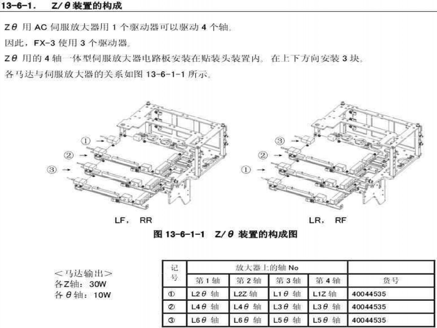 13 - 6 - 1 . Z / 0 装置的构成 z e m AC 何 服 放 大 器 n ] 1 个 驱 动 器 可 以 驱 动 4 个 轴 因 此 , FX - 3 使 3 个 驱 动 器 Z 0 IH 的 4 轴 休 型 伺 服 放 大 器 电 路 板 安 装 在 贴 装 头 装 背 内 在 t 下 方 向 安 装 3 块 各 3 达 与 何 服 放 大 器 的 关 系 如 图 1 3 - 6 - 1 - 1 卿 ② : : …