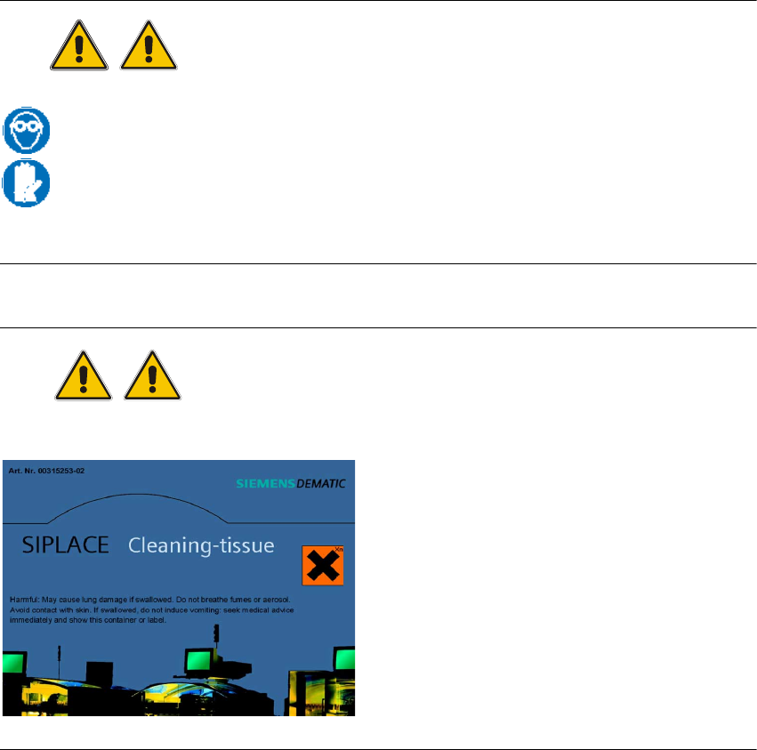 保養 HF 系列預防保養手冊 1 安全指示 03/2004 ㆗文版 8 警告 1 1 警告 1 SIPLACE 清潔紙巾 1 1 1 1 1 1 1 1 1 ○ 使用濃縮㆚醇來清潔模組時,請 務必戴㆖安全護目鏡與護手 套。 ○ 如果㆚醇不小心噴濺到眼睛的話 ,請立刻使用大量清㈬來沖 洗眼睛。 ○ ㈲害:如果吞嚥,可能造成肺部損害 。 ○ 請勿吸入蒸汽 / 噴霧 。 應避免與皮膚接觸 。 如 果不小心吞嚥 , 請不要㉂行催吐 。 請立刻就…