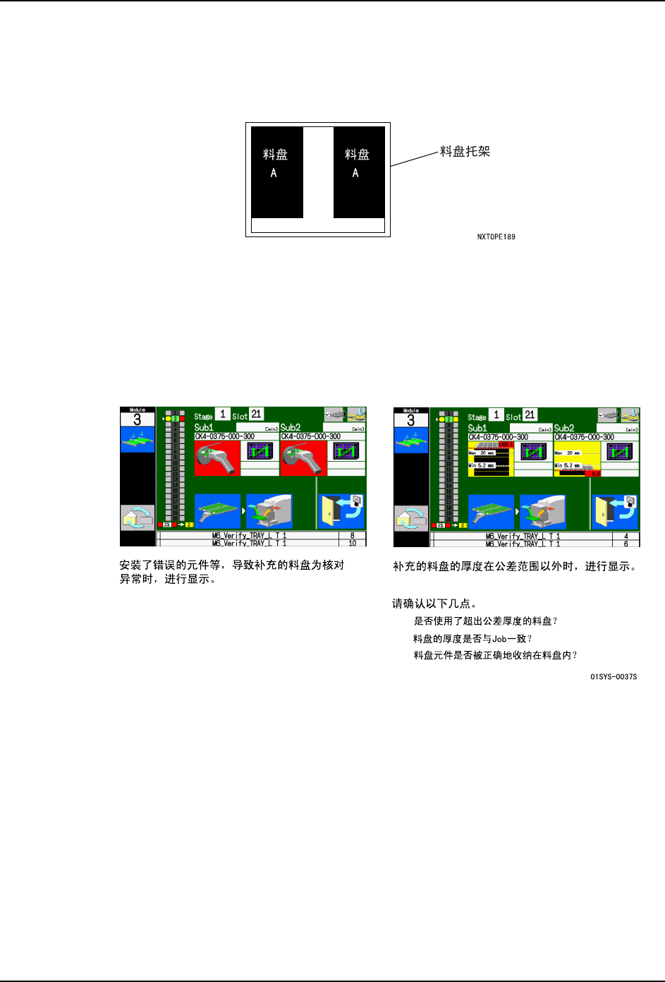 3. 正在向料盘箱 B 补充料盘时,如果料盘箱 A 发生补件超出时,就会在操作画面上显示料