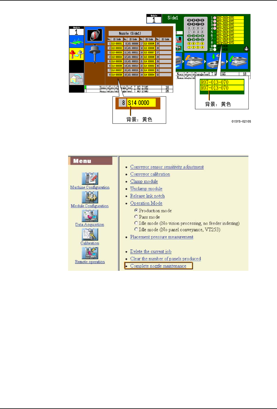 此时,操作画面的状态区域的示意图的背景变成黄色,告知操作者吸嘴置放台内有需要维修