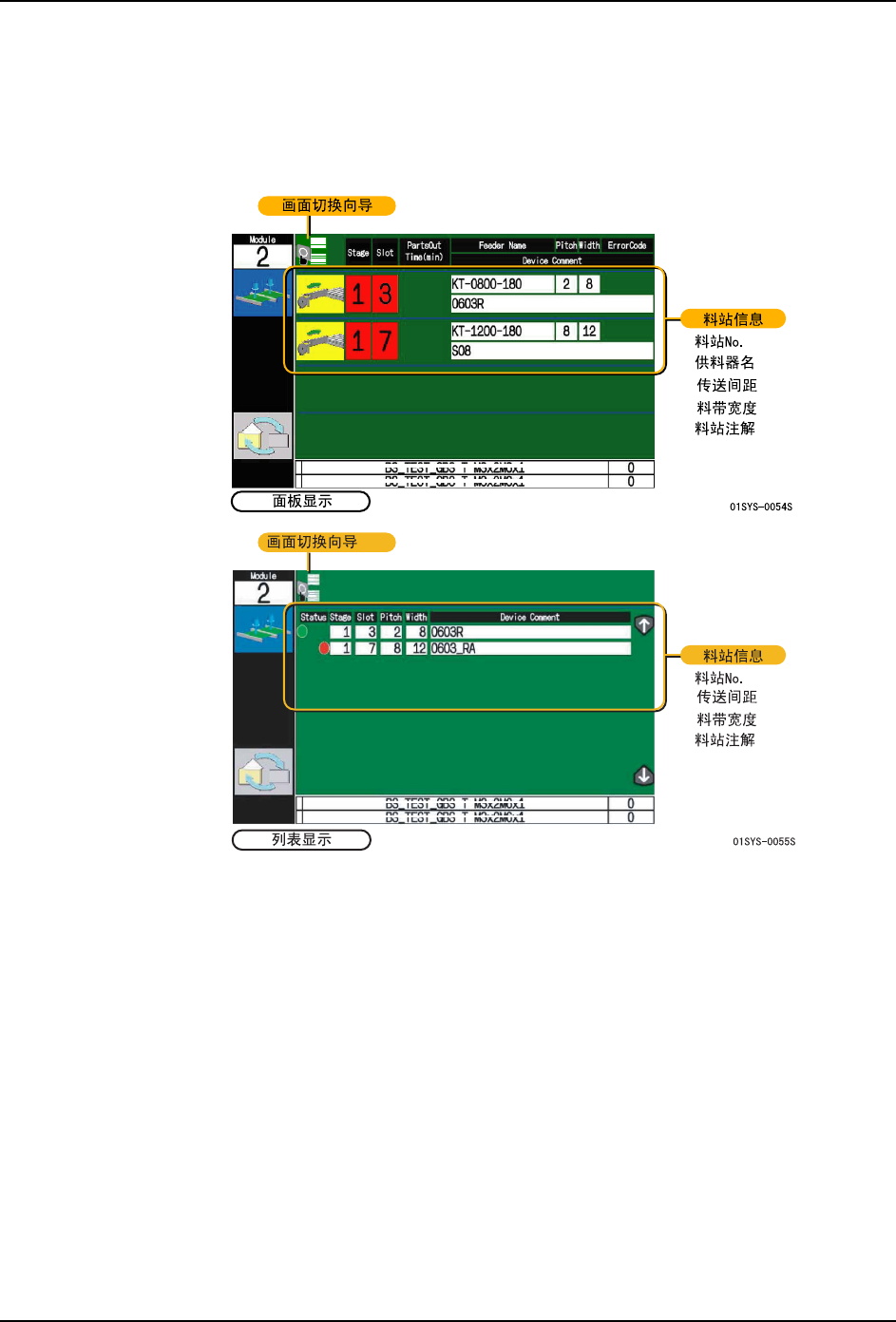 在 [ 列表显示 ] 画面上,能够知道安装更换供料器的场所。按上下键 (箭头键),画面就会