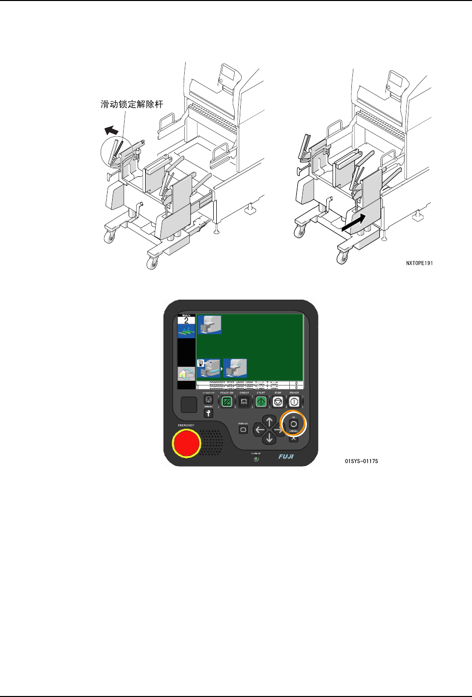 5. 换线 QD142-05 246 NXT II 系统手册 3. 请握住 PCU 滑动锁定解除杆,使 PCU 本体向前方滑动。 备注 )只有握住解除杆,锁定才会被解除。 4. 请按下 OK 按钮。料站托架被松开。