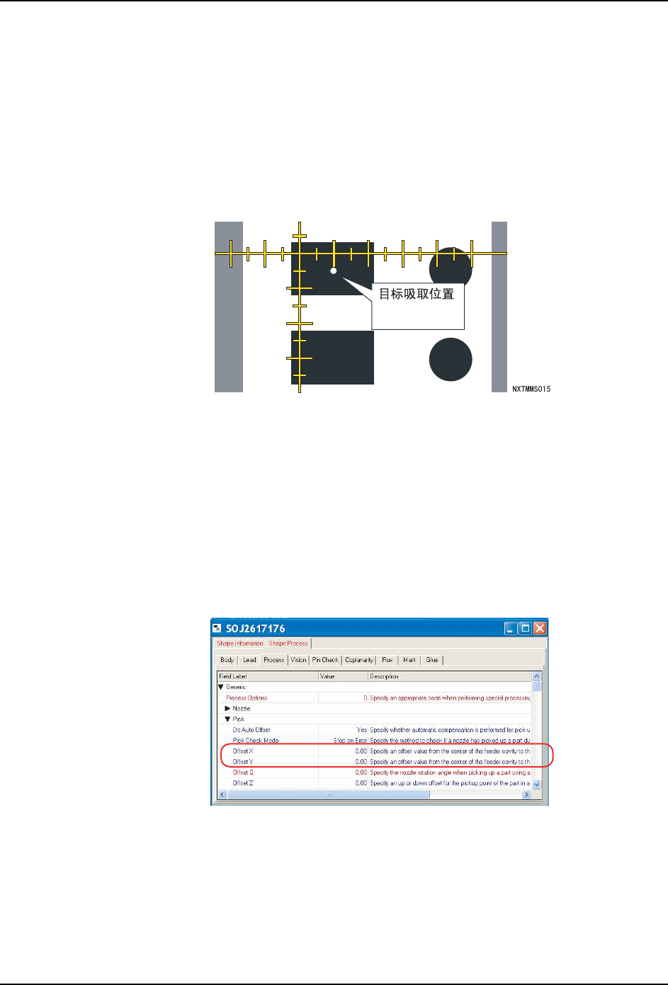 从吸取位置确认的结果中进行 Job 的吸取修正量设定。以下图所示的吸取位置的修正量为例