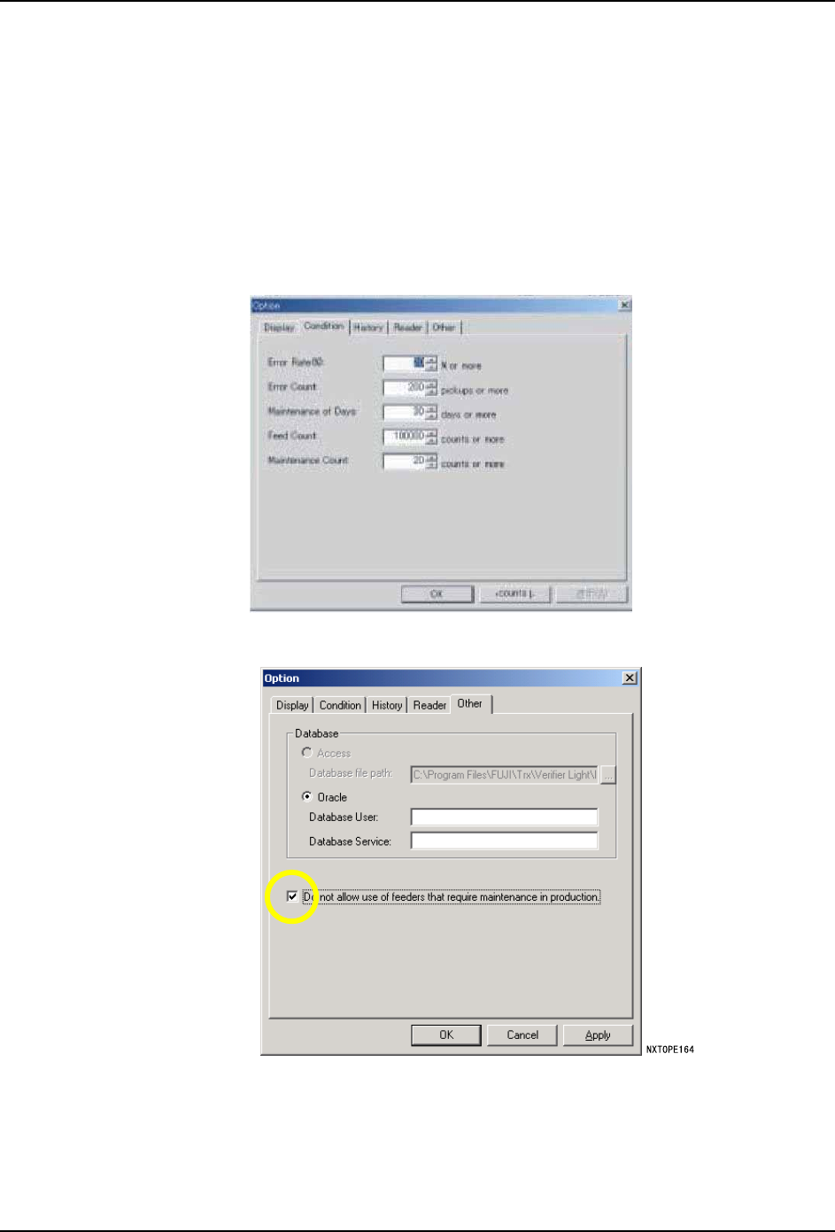1. 请通过 Advanced Maintenance 打开 [ 工具 ]-[ 选项 ]-[ 条件 ],设定供料器的维修保养