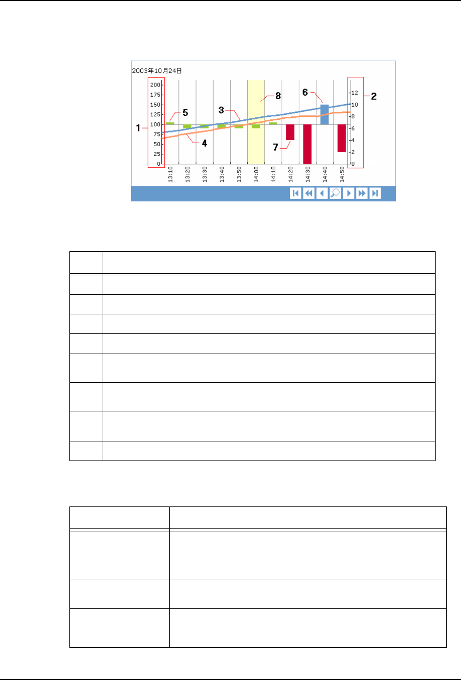 7. 辅助软件 QD142-05 298 NXT II 系统手册 趋势信息 [ 趋势 ] 页面的上部显示图表,下部显示所选择的期间中的有 关模组的信息。 在页面上部所显示的图表表示各 个单位时间段的电路板的生产总数 和生产预定生产数所需 要的时间。 在 [ 趋势 ] 页面的下部显示出模组的详 细信息。 这个区域的显示方法有 表格显示、 柱形图显 示、应用显示的 3 种方法。在初始状态下,打开 [ 趋势 ] 页面后,显示出应用画面。 号码…