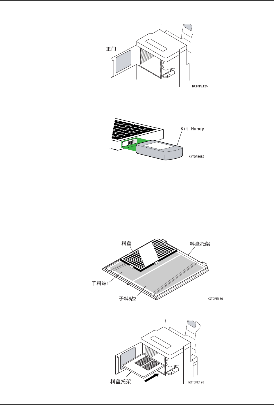QD142-05 4. 生产 NXT II 系统手册 75 1. 打开料盘单元 -L 的正门。 2. 从要补充的料槽上拔下料盘托架 。 3. 请 使用 KIT Manage r 或 KI T Handy 进行新料 盘的快速验证。 a. 在 KIT Handy 画面上选择要 补充的料槽。 b. 使 用 KIT Handy 进行元件条形 码或者 DID 的扫描。 如果使用了附加位置检 查的料盘验 证 , 请进行 FIDL (供料托架)和 D…