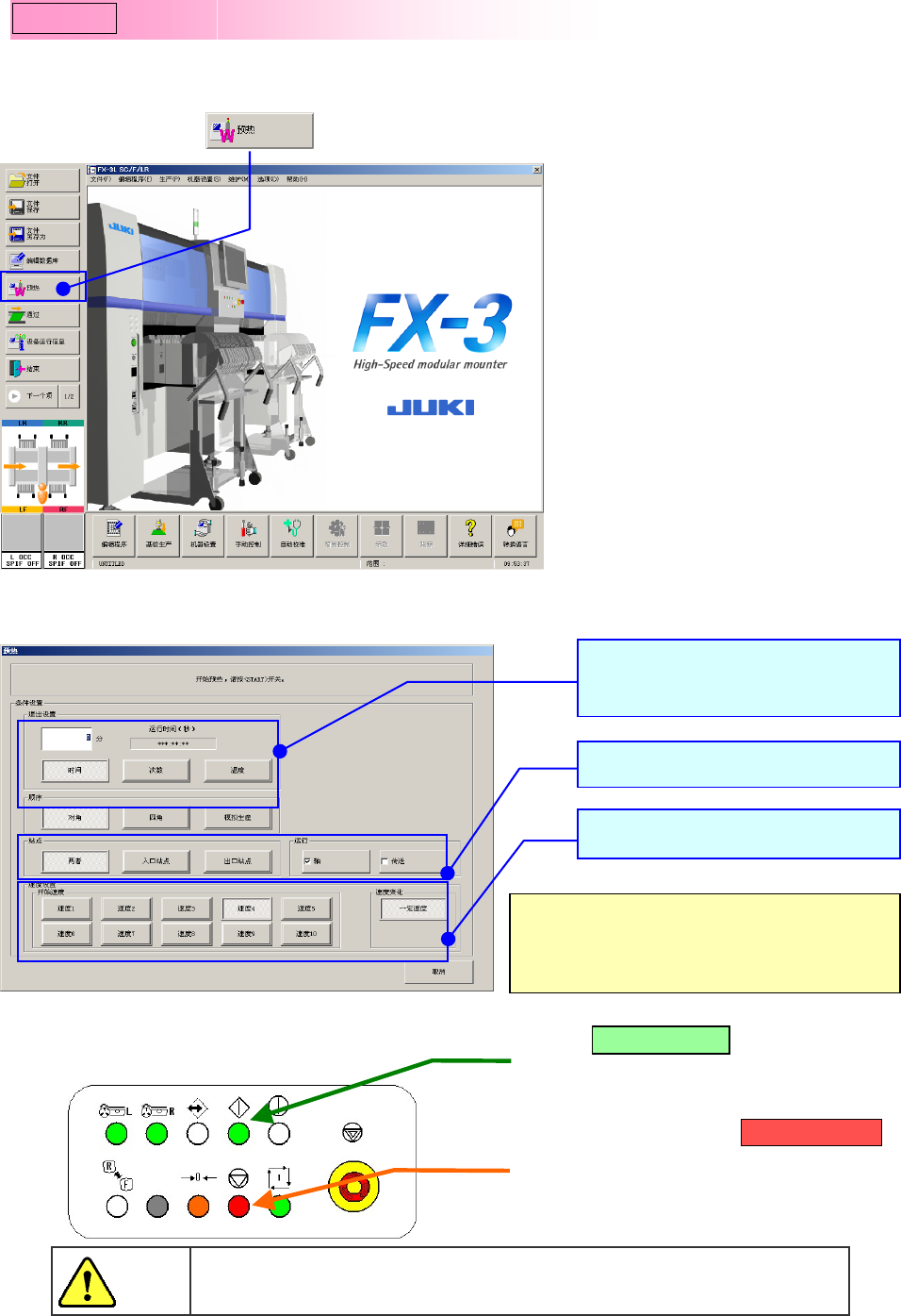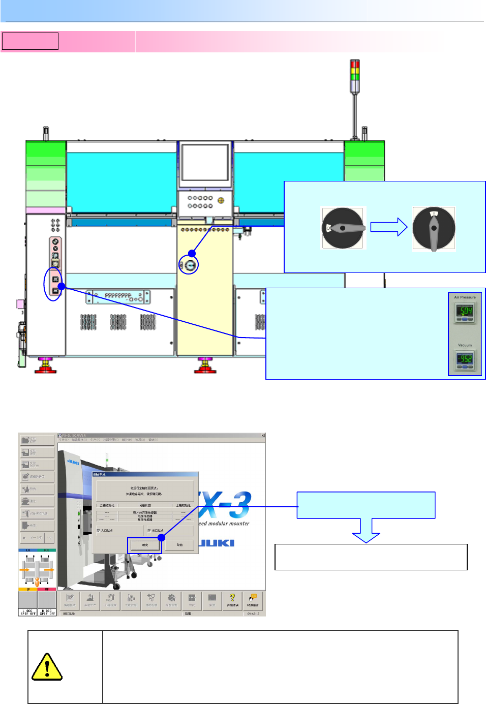 操作手册 Rev00 2- 2 ① 请确认设备内部没有放置基板或工具等物品。 ② 向右旋转主开关,确认气压表(压力表) 。 ③ 依次起动 Windows XP 和主机的软件后,画面会显示如下信息。 全轴开始移动,返回原点。 警告 执行返回原点时,设备开始移动。 为避免发生人身伤害,请绝对不要把手和头部等伸进装置内部。 此外,请确认装置内部 没有放置扳手等可能碰撞贴片头的物品之后 ,再执 行返回原点。 请选择「确定」 。 Step1 主机…