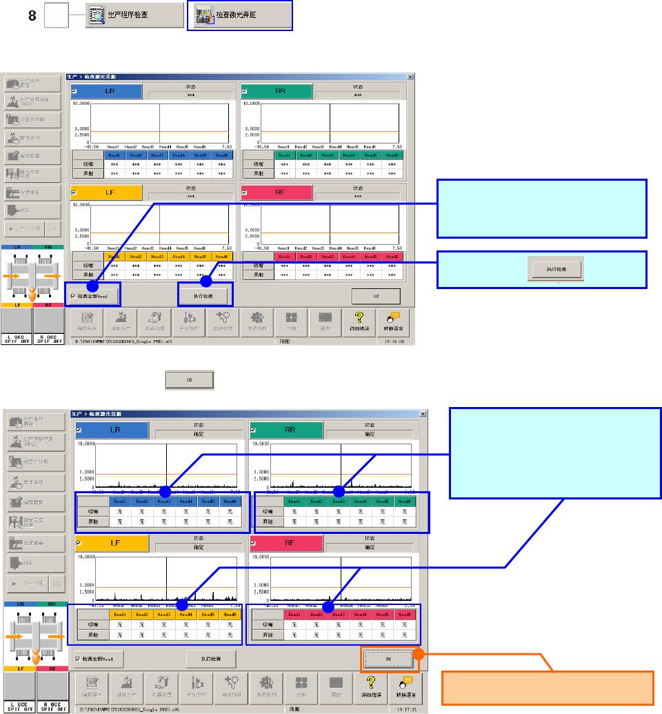 操作手册 Rev00 2- 26 <步骤 2> 检查激光弄脏 ① 请按下按钮「检查激光弄脏」 。 ② 显示「检查激光弄脏」画面。 ③ 清扫后,请按下按钮 ,确认没有「弄脏」 。 通常情况下请勾选 「检查全部 Head」 。 请按下按钮 发现“弄脏”时,请按 照『操 作手册 II 』 的 「第 5 章日常检查」 的说明,清扫激光单元。 确认后,按下按钮「OK」 。