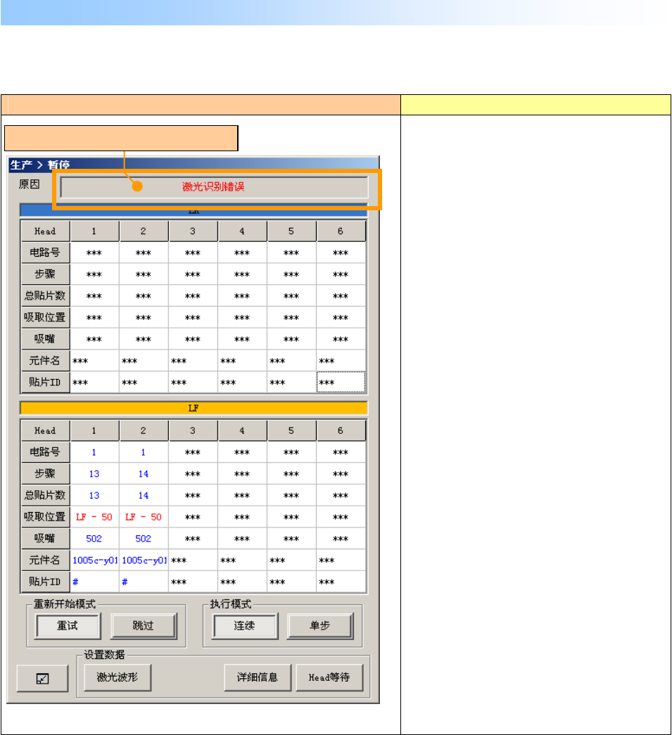 生产程序的各种数据与激光测量的数据不一致时,显示如下画面,装置暂停。