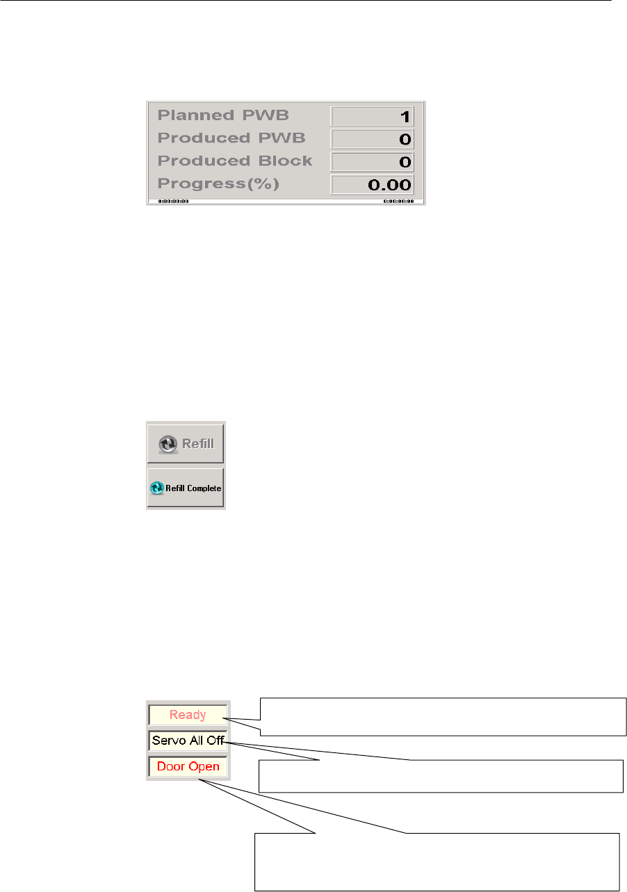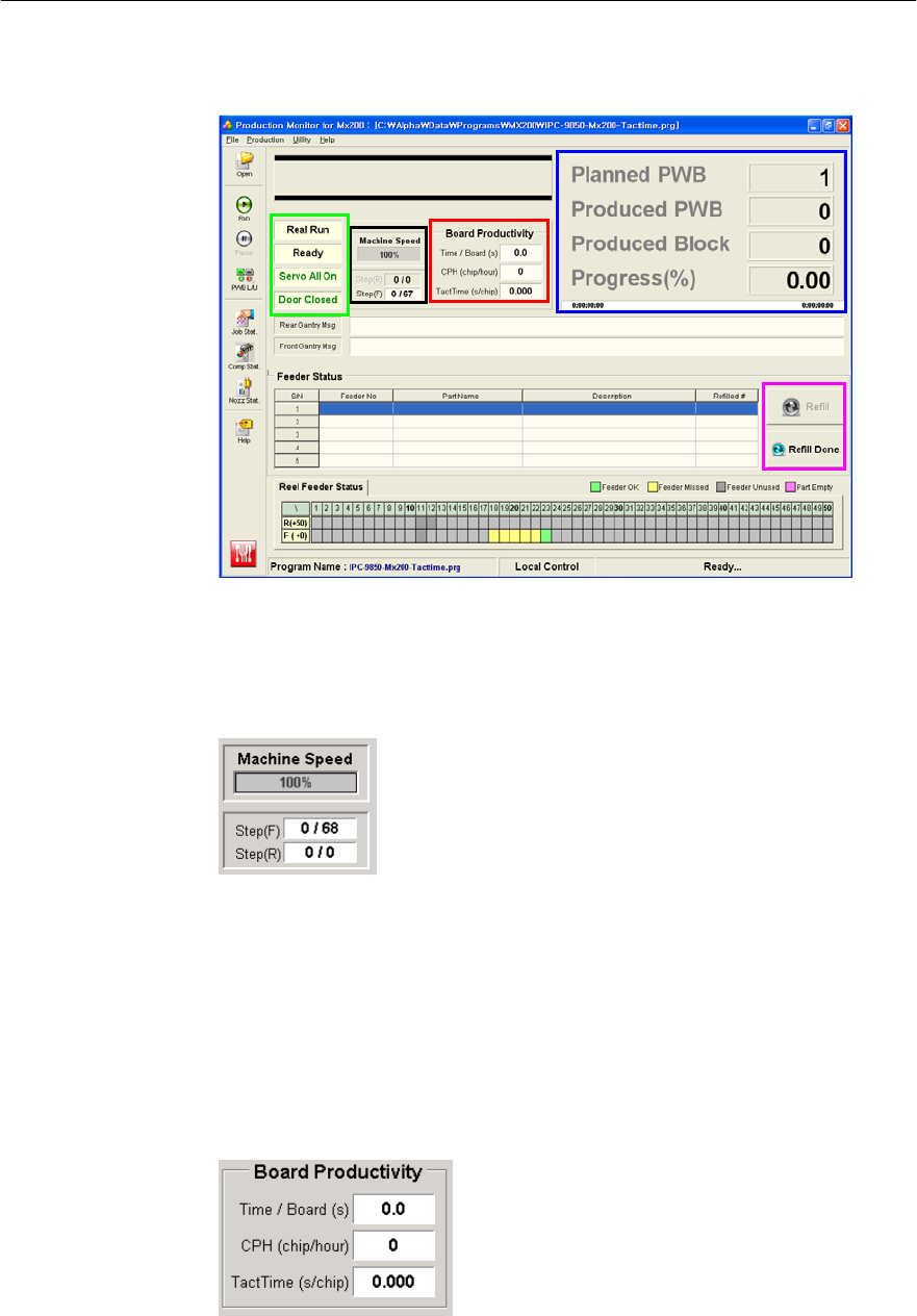 Mx Series Manual 1-84 3. PWB 生产信息 • Planned Board : 显示当前的计划生产量 。 • Produced Board : 显示已完成生产的数量 。 • Block / Board : 显示有 Block 的印制电路板 中正在进行作业的 Block 位置。 • Progress : 是生产 目标数量与已完成数量之比 。(进行率) 4. Feeder Refill (部件补充)信息 • Refi…