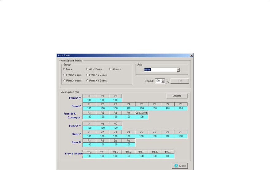 Mx Series Manual 1-86 4. 速度设置 (S) - 控制用于设备 XYRZ, TFU,TSU 的轴速度,主要用于 TFU Y 轴的控制。与程序编 辑器内各个部件的速 度无关,是适用于所有轴的 值。 图1 - 8 4 速度设置画 面 > 5. 参数设置 (P) - 是关于 Conveyor 速度 , Fiducial mark 检 查项目的设置,客户 不能使用。 ( 是装 有 2 个G a n t r y 的设备…