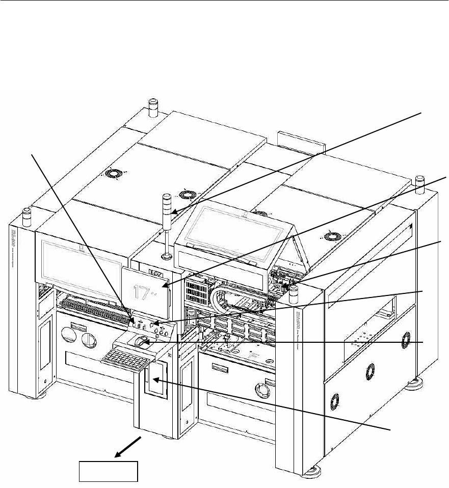 제 2 장 장비의 개략적 설명 2-11 Mx800/P 装备外观主要部分名称 1.TOWER LAMP: 装备出现异常时, 显示为 3 种颜色(红、黄、绿)。 2.EMERGENCY SWITCH: 装备出现异常时,强 行停止装备的应急开关。 3.17” LCD Monitor: VISION & PC MONITOR 兼用 4.OPERATING SWITCH: 运 行简便的布局( Layout )。 5.KEY BOAR…