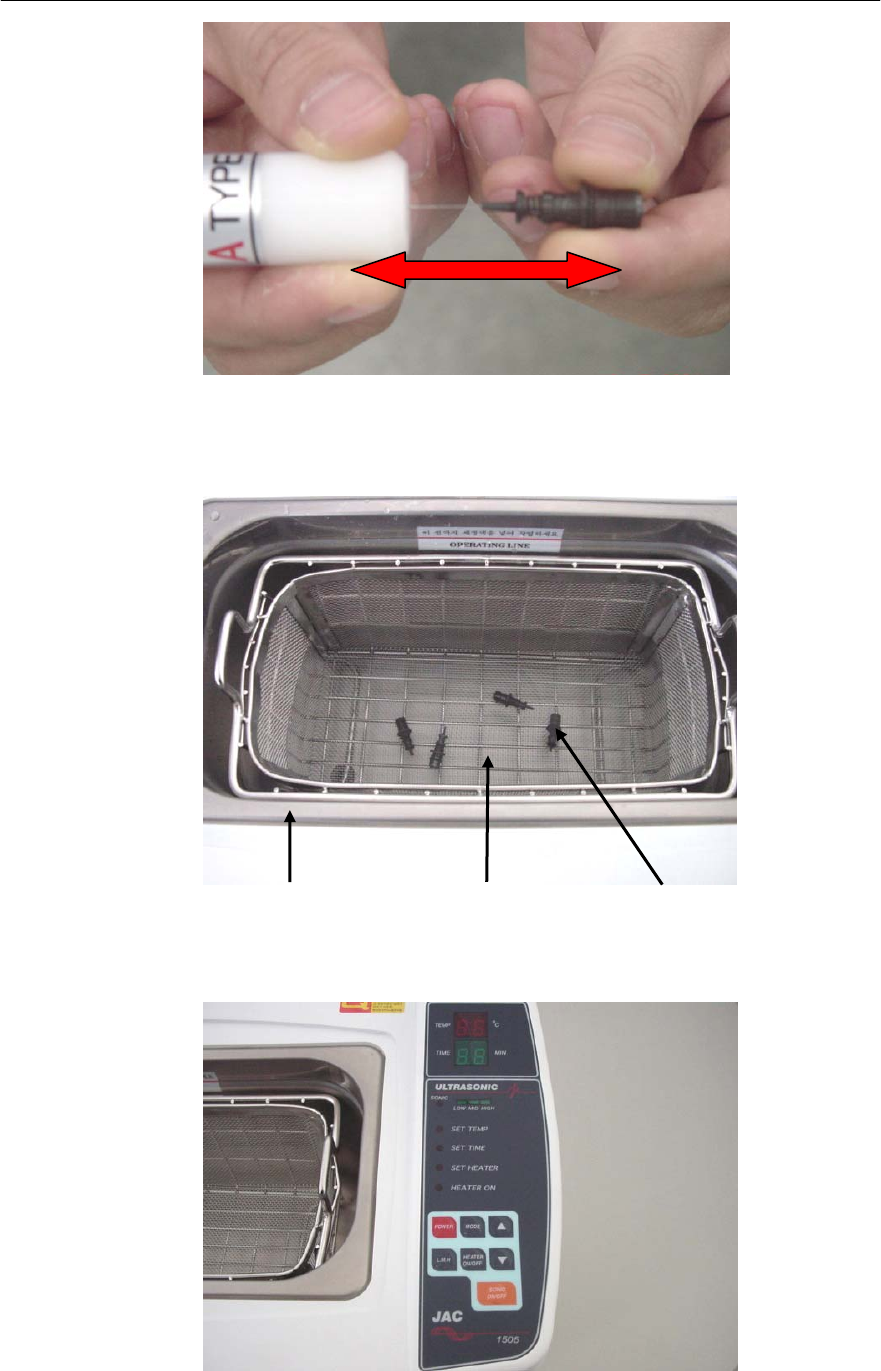 第 3 章 维修及检验方法 3-13 3 . 将适量清洗液倒 入超声波清洗机,放入N o z z l e 。 - 清洗液:异丙醇 4. 清 洗 约 30Min(清 洗 机 温 度 60℃ )即 可 完 成 。 超声波清洗机 清洗用酒精 N o z z l e