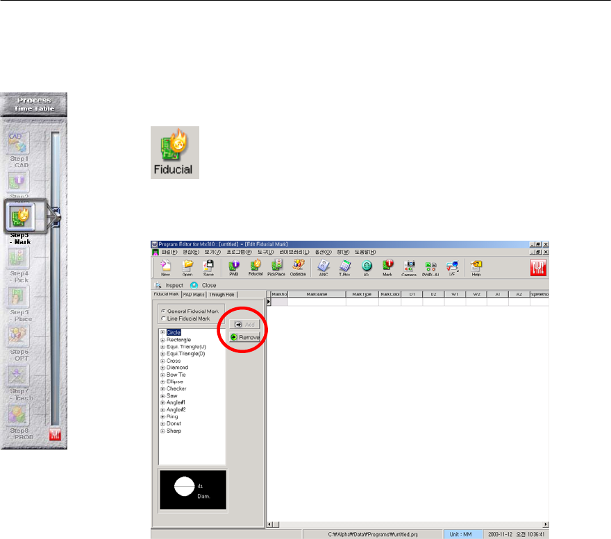 Mx Series Manual 1-22 输入 Fiducial Mark D B ( 基准数据 ) 输入 Fiducial Mark DB ( 基准数据 ) - 输入要使用的 Fiducial Mark DB。 选择主画面的 Fiducial Icon( 基准图符 )。 图 1-19 Fiducial Information( 基准信息 ) 主窗口 > Fiducial Mark( 基准标记 ) 有以下两种方式 。 ( 基本方…