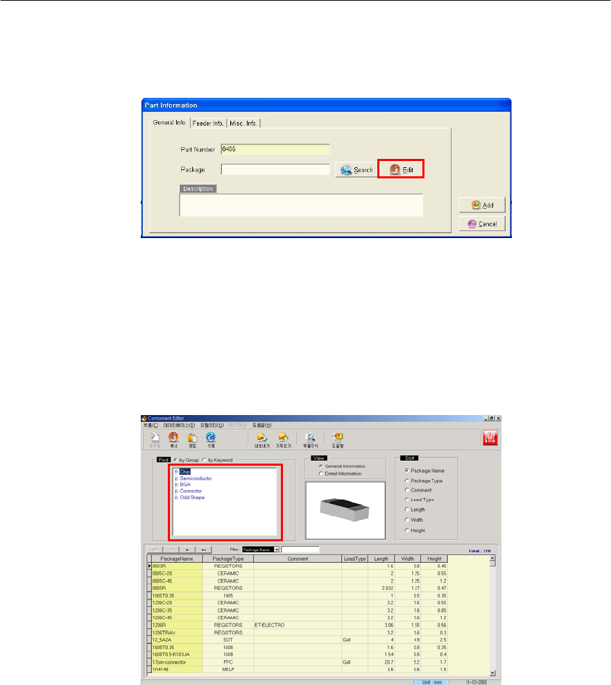 第 1 章 开始程序 1-27 Comp DB Editor( 部件 编辑器 ) 的使用方法 在 Part Information( 部件信息 ) 窗口选择 Edit 图符。 图 1-27 选择 Part Information( 部件信息 ) 窗口的 Edit( 部件编 辑器 ) > General( 普通 ) Info Tab / Edit 的 功能是在要选择的 Package 在 Data Base( 部件信 息 ) 中不存…