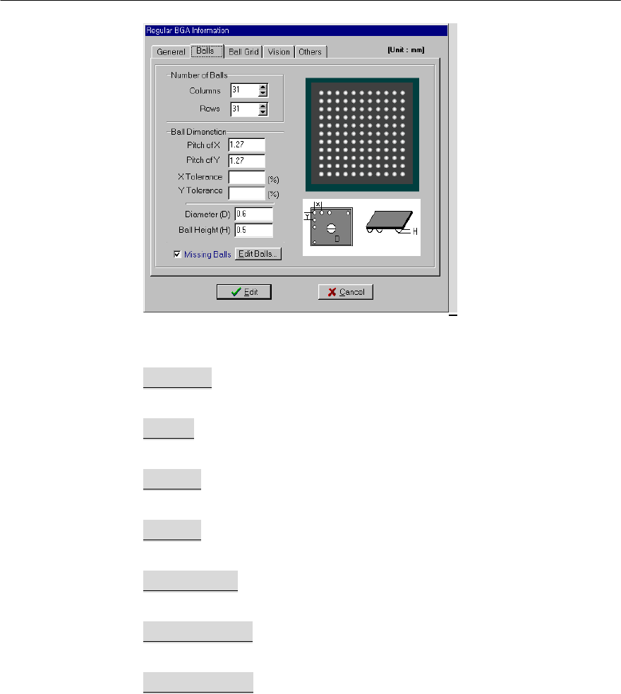 Mx Series Manual 1-36 图1 - 3 2 新部件添加窗 口 -BGA> Columns 这是横向(行)球 ( B a l l ) 的最大个数 。 Rows 这是纵向(列)球的最大个数 。 Pitch X 横向球与球之间的距离 。 Pitch Y 纵向球与球之间的间离 。 Diameter (D) 这是 Ball (球形)的直径 。 Ball Hei ght(H) 这是 Ball (球形)的高度 。 Missi …