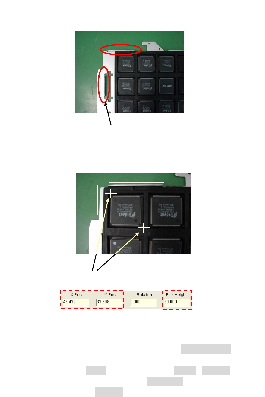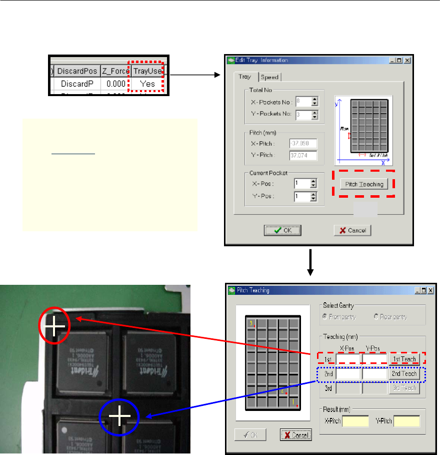 Mx Series Manual 1-46 Tray X-Pitch , Y-Pitch 输入方法 选择 第一个部件 横向基准 纵 向 基 准 实施Teaching 双击 Program Editor 的相应 位置 ( 图中的 Yes ) 后,把设备的摄像头移 到照片上的 Teaching 位置, 然后实施两 个位置的teach。