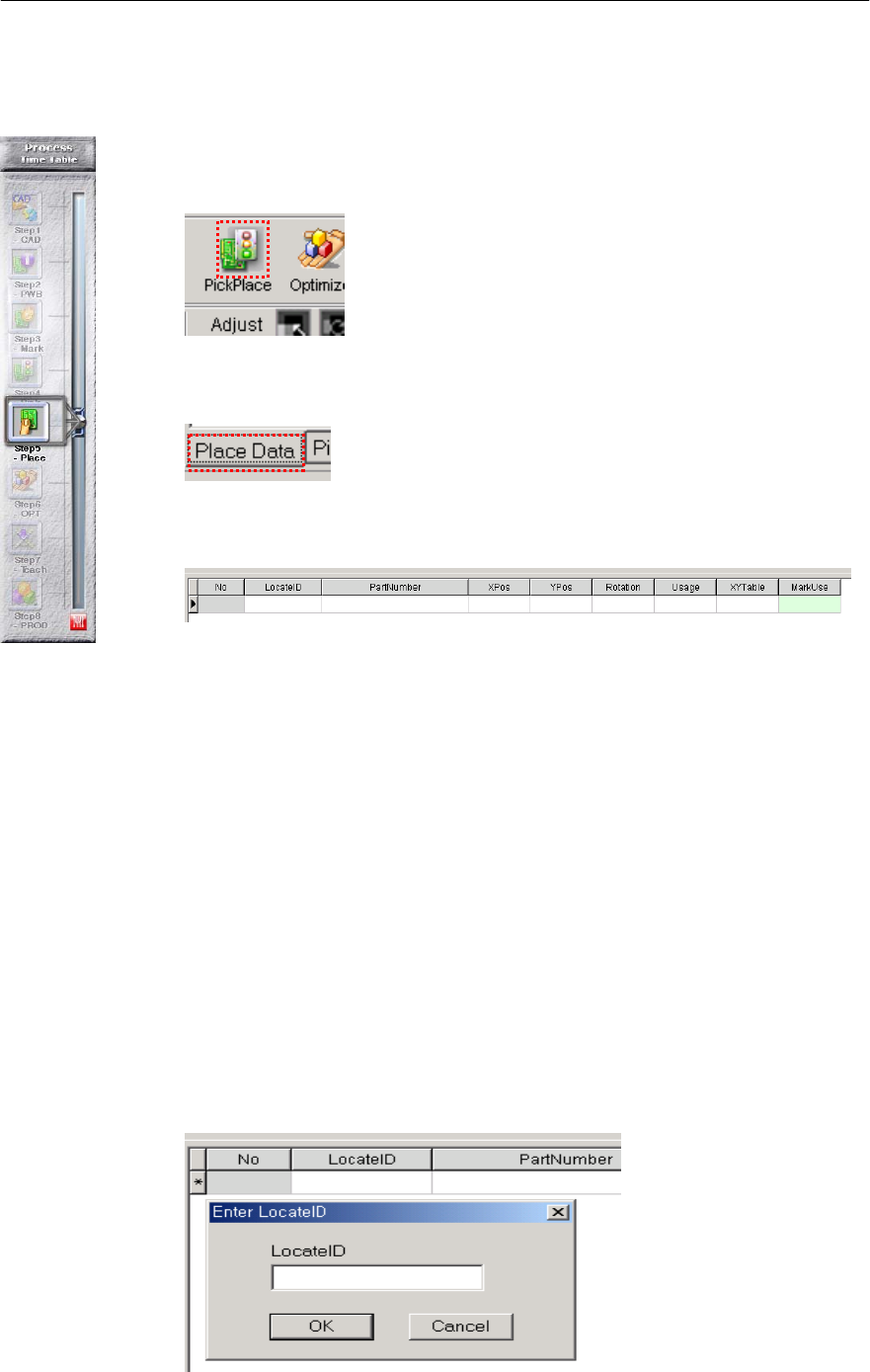 第 1 章 开始程序 1-49 输入 Place Data ( 贴装数据 ) 输入 Place Date( 贴装数据 ) 这是不使用 CAD Conversion ( 辅 助设计文件的转换 ) 时,直接输入 Place Dat e ( 贴装 数据 ) 的步骤。如果使用 CAD Conversion , 也可以过渡到下一章 的数据检查部分。 在主画面上选择 Pick & Place ( 拾取 & 贴装 ) 图符。 选择下端…