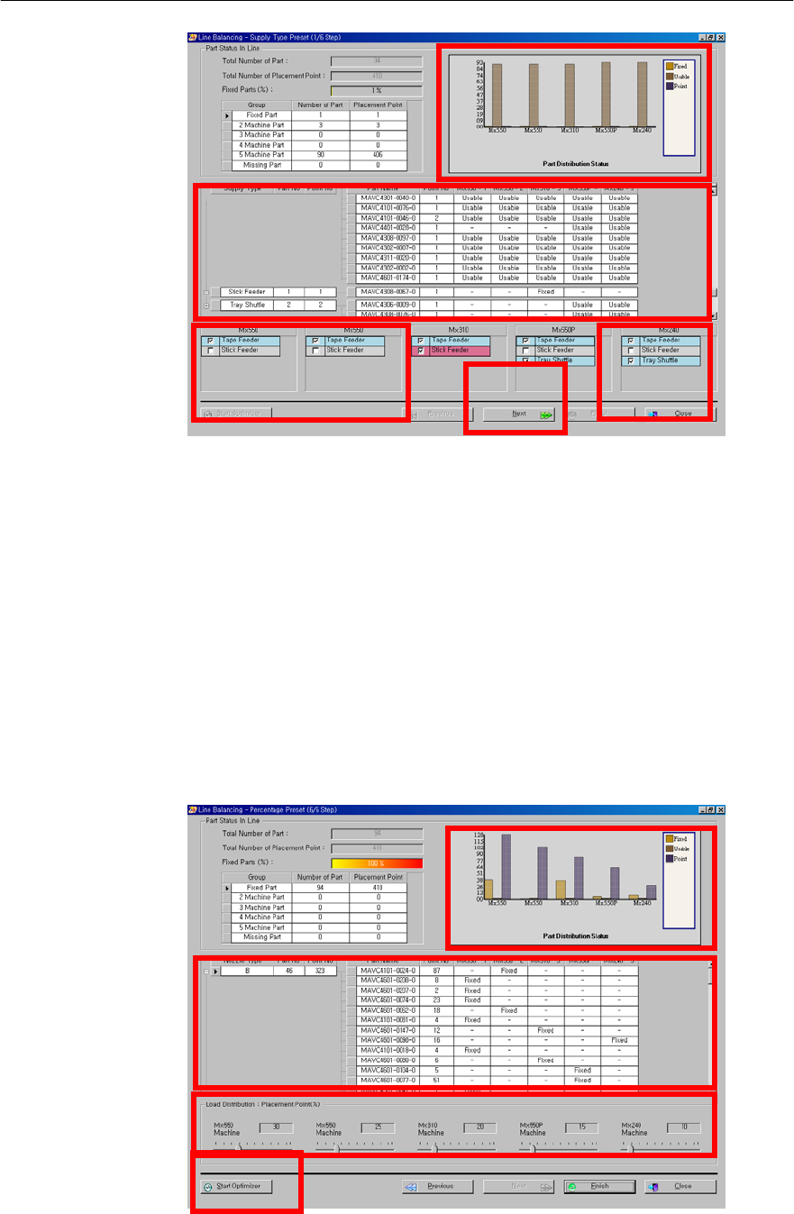 第 1 章 开始程序 1-55 图 1-47 Line Optim izer 阶段选择画面 > 1). 从 Line选 择设 备 ( 或 Line) 。 2). 在 Group 中参照 各设备的使用与否。 3). 在各个设备 中选择可供选择的 Supply Type( tape f eeder, stick f eeder, TSU, TFU) 4). 确认实时发 生变化的 Line 最优化结果。 5). 设置结束后 ,利用 “N…