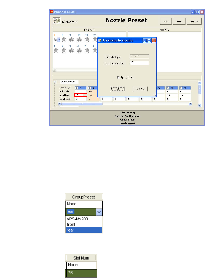 第 1 章 开始程序 1-61 1. 如下图所示,在想要 分配的 ANC hole( 孔 ) 上点 击( click )鼠标器,便显 示 ( display )可分配的 Nozzle Type 。 2. 在该 ANC hole 上点击自己想要的 Nozzle Type ,进行设置。 图 1-54 Nozzle Prese t (喷嘴预置)窗口 > • 设置最大喷嘴 数量 : 对于各个种类的喷嘴 ,可以设置能够使用的喷嘴 数量。如下…