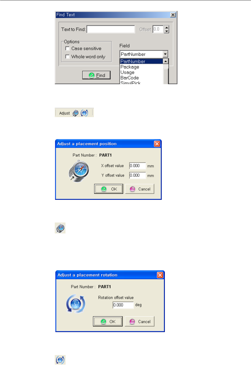 Mx Series Manual 1-66 图 1-57 Find( 搜索 ) 功能 > 对 Adjust( 调整 ) 菜单加以说明。 图 1-58 Adjust Posit ion( 坐标修改 ) 功能 > : 这是 Adjust po sition( 坐标修改 ) 功能,把贴装位置,即 X, Y 位置,利用相同的 Offset ,能够同时修改 1 个或多个 X , Y 位置。使用条件主要 是在移动对象同时发生错 误时使用…