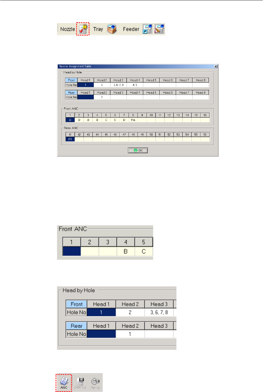 第 1 章 开始程序 1-71 选择 View Nozzle Assignment Table ( 阅览拟使用的喷嘴 ) Icon 。 图 1-63 View Nozzle A ssignmen t Table( 阅 览拟使用喷嘴 ) 画面 > 分别确认各 ANC 的 Hole 中使用的喷嘴及各 Hole 编号的 Head 使用 状态。 已确认的事项在设置 MSETUP 程序的 ANC Information( 喷 嘴更换装置信息…