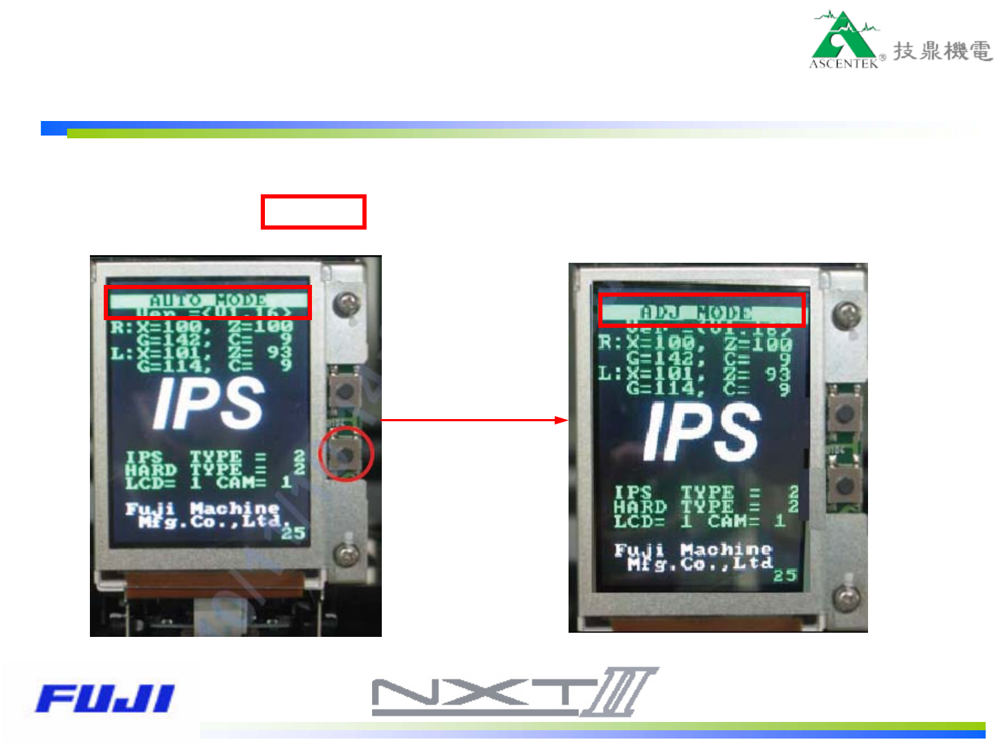 1.按下鍵3秒,出現ADJ MODE畫面