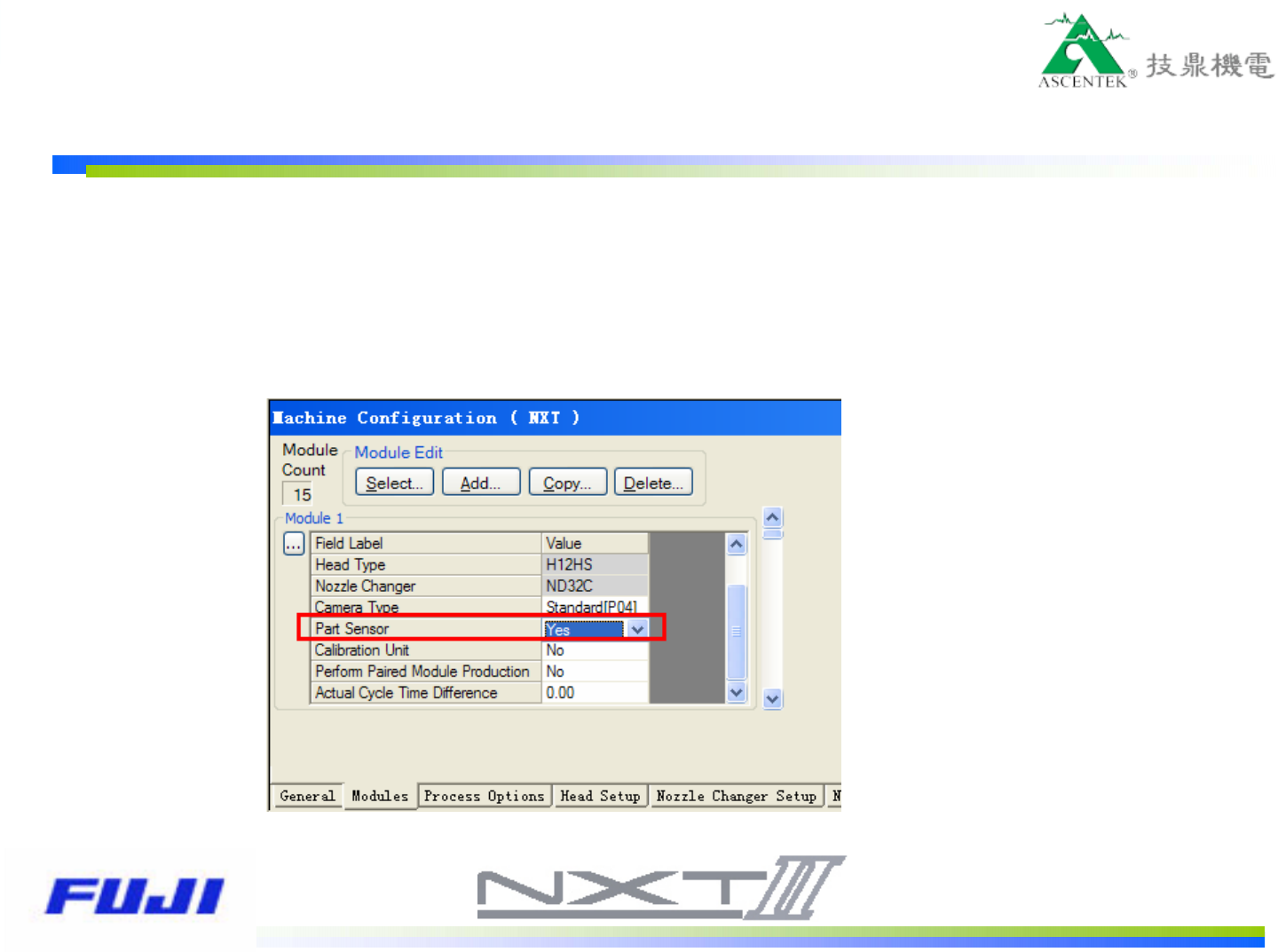 一、IPS功能使用 1.模組的設定 在FUJI Flexa 的Machine Configuration窗口內進行模組的設定,路徑: 【Machine Configuration】-【Modules】-【Part Sensor】: Yes