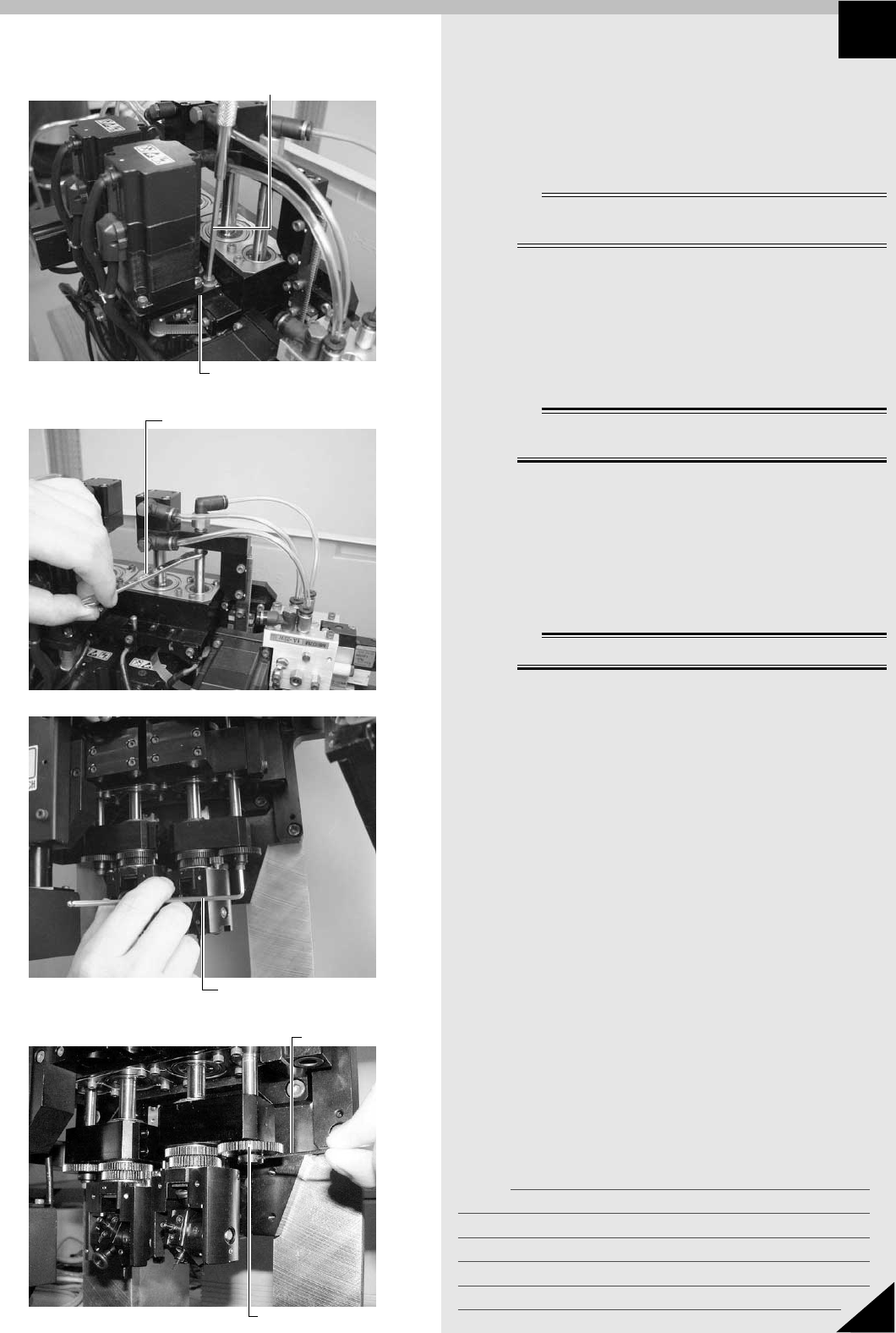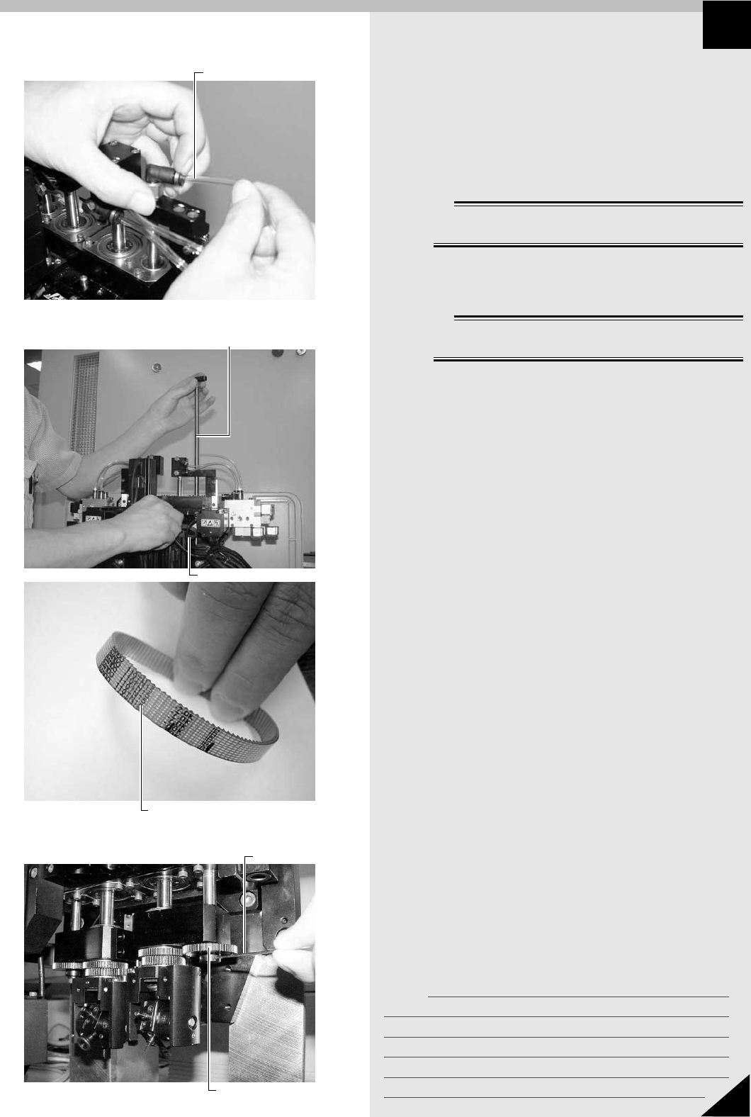 メモ 20 2 Section JMC4011102 5. N 軸ベルトの交換 7 インデックススプライン上端のエアジョイント からエアチューブを抜きます。 8 新しい N 軸ベルトを入れます。 1 . インデックススプラインシャフトを上げてベルト を入れ、プーリーにかけます。 c 注意 N軸ベルトはベルトの文字が読める向きでインデックススプラインに 掛けてください。 2 . インデックススプラインを下げて、ベアリング穴 に挿入します。…