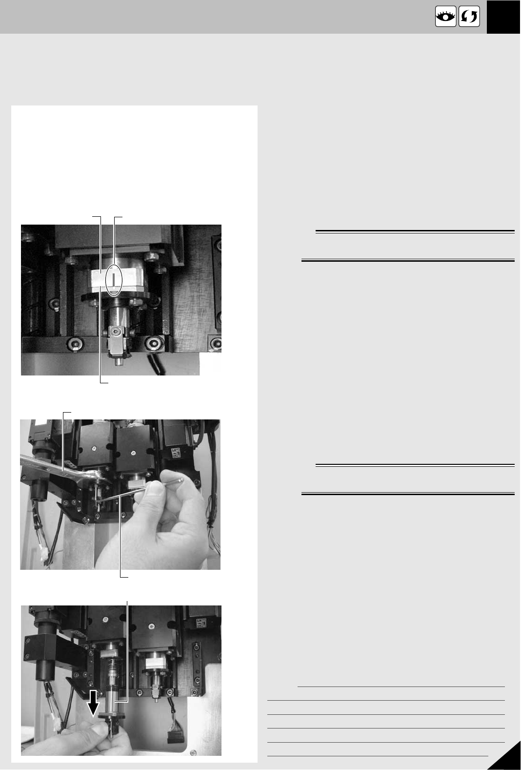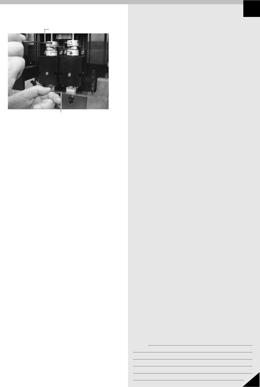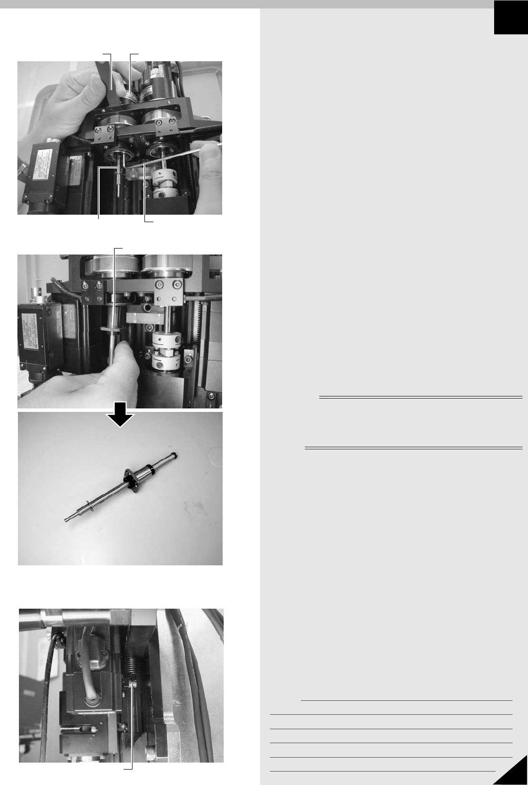 メモ 16 5 Section JMC4011102 4. R 軸シャフトの交換 q マシンを起動して、原点復帰を行います。 w 非常停止ボタンを押します。 e カップリングの向き ( 角度) を合わせます。 1 . R 軸シャフトを交換したカップリングの上側ボル ト 2 本を六角レンチ (2.5) で緩めます。 2 . ヘッド 1 と 2 のノズルを同じ向きにし、メイン シャフト ( 四角部) に定規などの平らな物を当て て、ヘッド …
