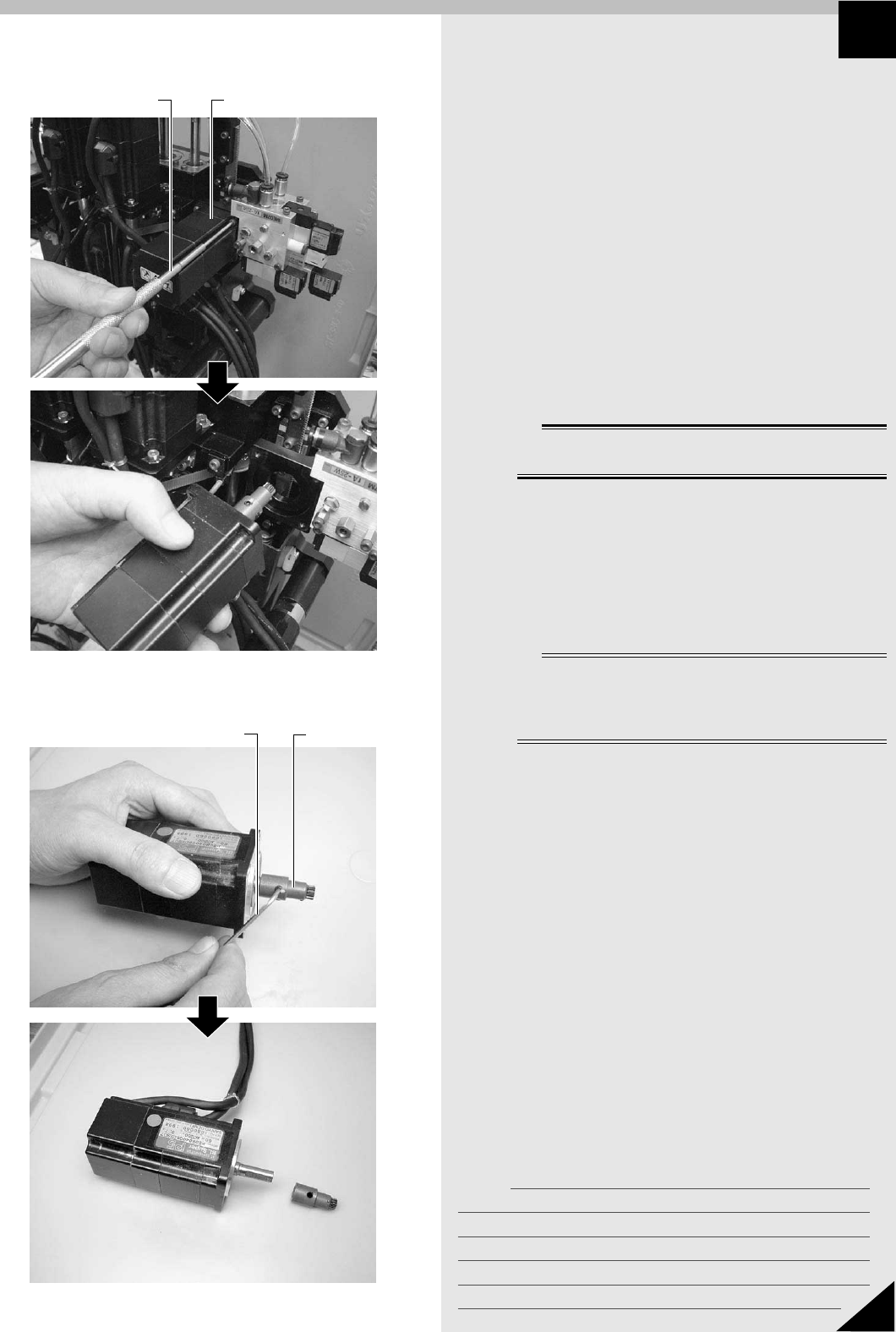 4 メモ 2 Section JMC4011102 2 . Z 軸ラックギヤの交換 ヘッド部のノズルシャフトを上下させる Z 軸ラックギヤが変形したり、歯欠けして、 Z 軸移動が不安定になった場合は交 換が必要です。Z 軸ラックギヤの交換方法を説明します。 ■ 用意するもの ・ 六角レンチセット ・ モリブデングリス ・ 新しい Z 軸ラックギヤ ■ 取り外し手順 w 警告 作業を始める前に、マシンの電源スイッチがOFFになっていること…