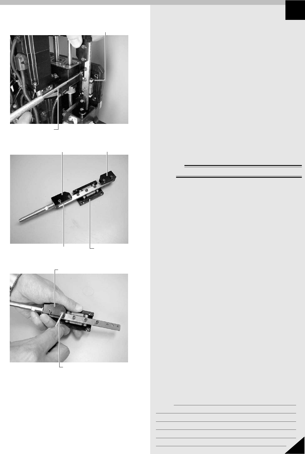 メモ 5 2 Section JMC4011102 2. Z 軸ラックギヤの交換 5 Z 軸安全センサーの取り付けステイを取り外し ます。 ステイは Z 軸ラックギヤに沿って取り付けられてい ます。ステイ下部のボルト 2 本を六角レンチ (2.5) で取り外してください。 6 Z 軸ラックギヤの下にあるピンブロックを取り 外します。 Z 軸ラックギヤの下部には、サーボが解除された状態 でもヘッド部が下降しないように、リターンスプリ ング…