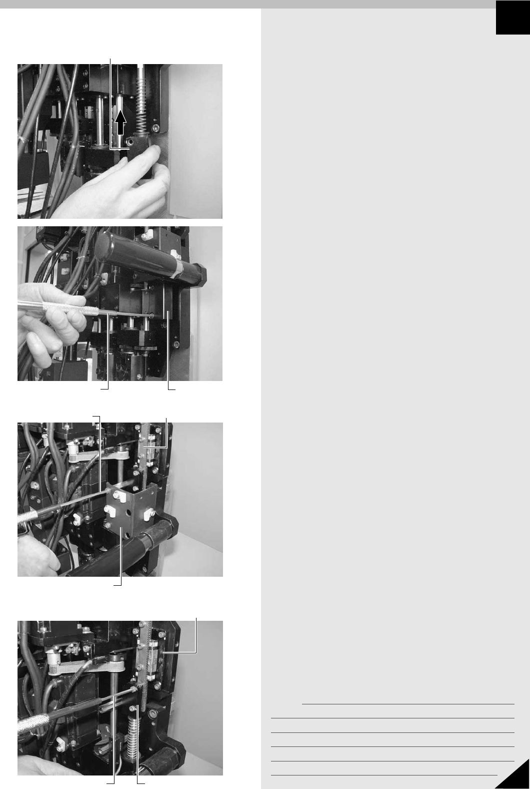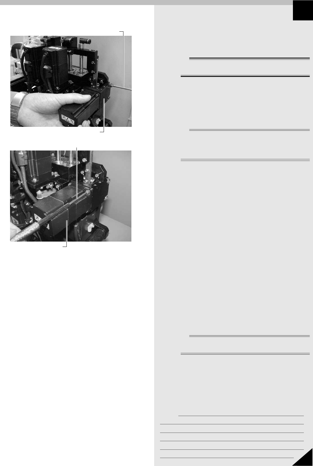 メモ 9 2 Section JMC4011102 2. Z 軸ラックギヤの交換 q Z 軸モーターホルダーを組み付けます。 六角レンチ (4) で Z 軸モーターホルダーのボルト 2 本を締めて、組み付けてください。 c 注意 Z軸モーターホルダーの段になった箇所をヘッド部ハウジングの端面 に正確に当て付けて、ボルト締めしてください。 w Z 軸モーター取り付けボルトを徐々に締めます。 Z 軸モーターシャフトのピニオンギヤをラックギヤ…